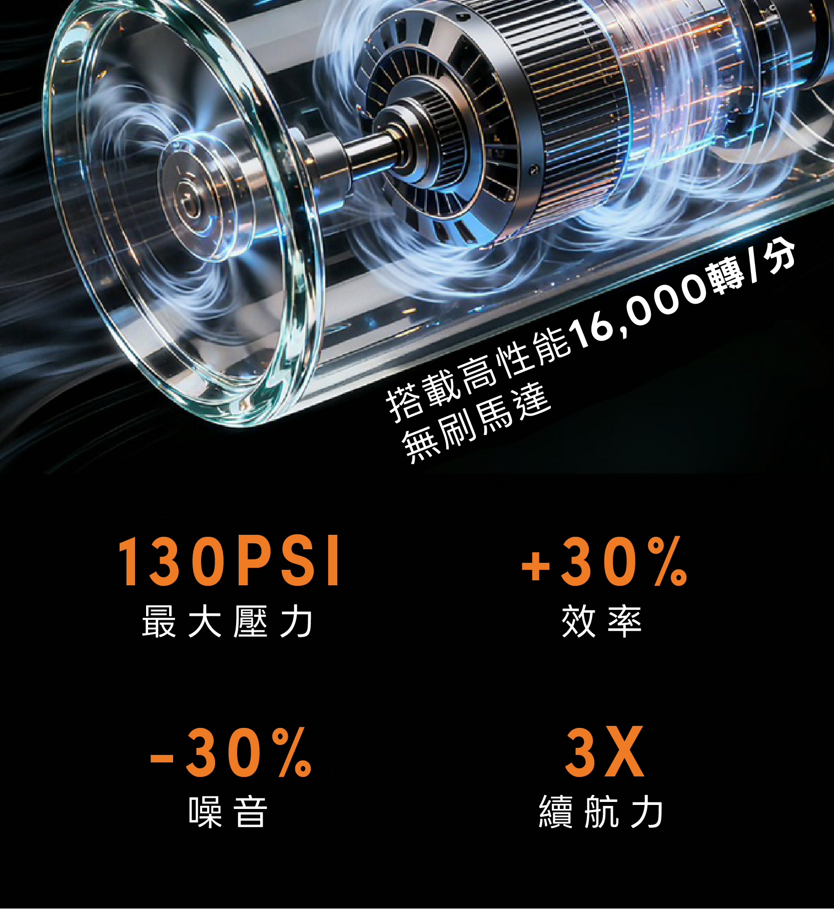 OUTZAC 充氣泵的核心是一套專利氣流系統,採用高效率無刷馬達驅動。透過應用流體力學原理,優化氣流、減少能量損耗,提供穩定強勁的充氣效能,同時保持低噪音與持久耐用性。最高可達 130 PSI 壓力,將專業級性能濃縮於口袋尺寸的打氣筒中。