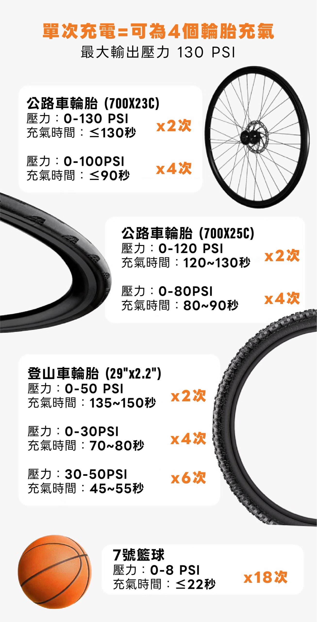 A:最高可達 130 PSI(9 bar),適用於公路車、登山車、城市自行車,甚至運動球類。