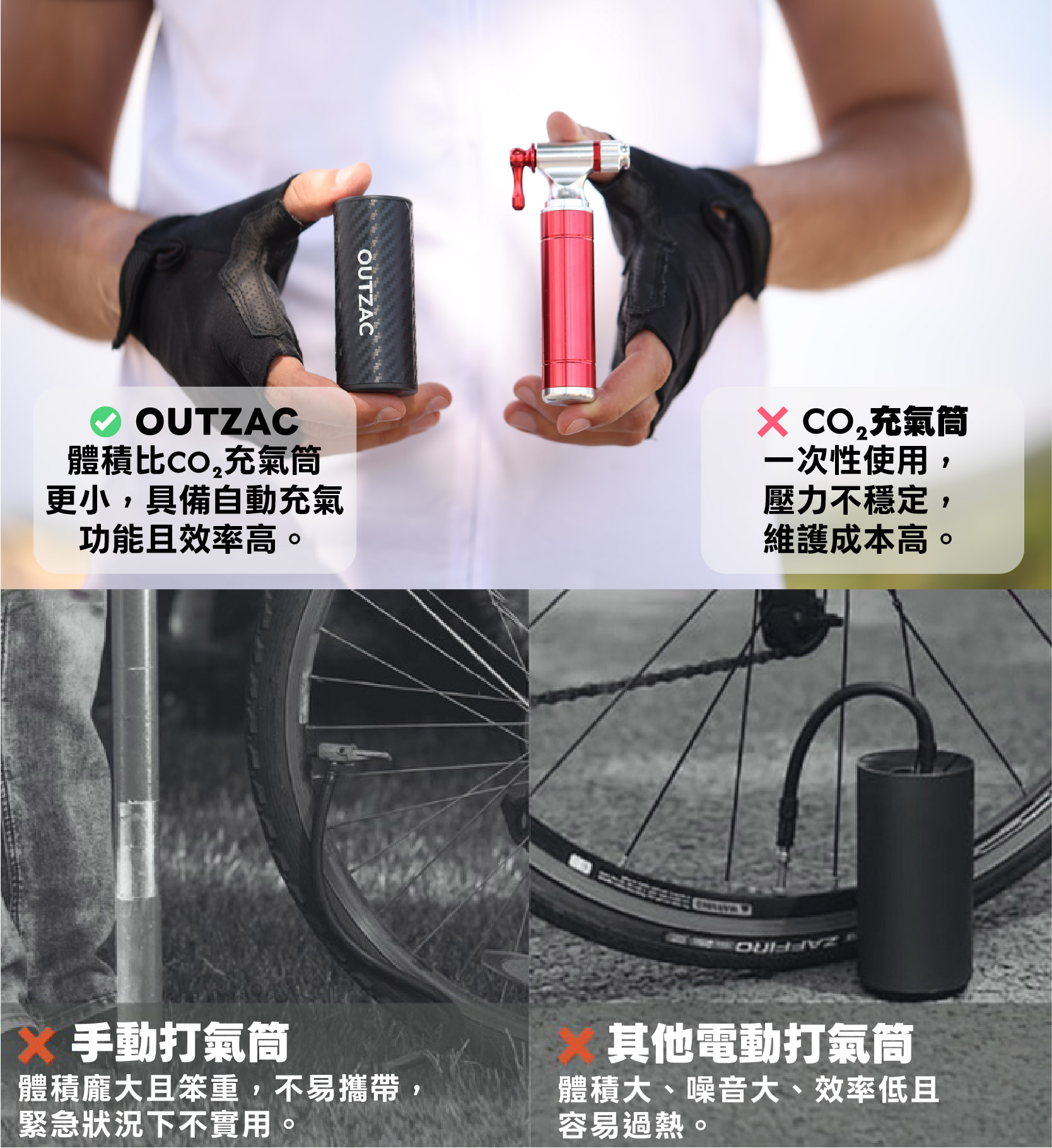 OUTZAC 充氣泵體積比 CO₂ 充氣筒更小,也沒有浪費或一次性使用的限制。可充電、重複使用,不再需要費力手動打氣或因為手動打氣而壓力不均!