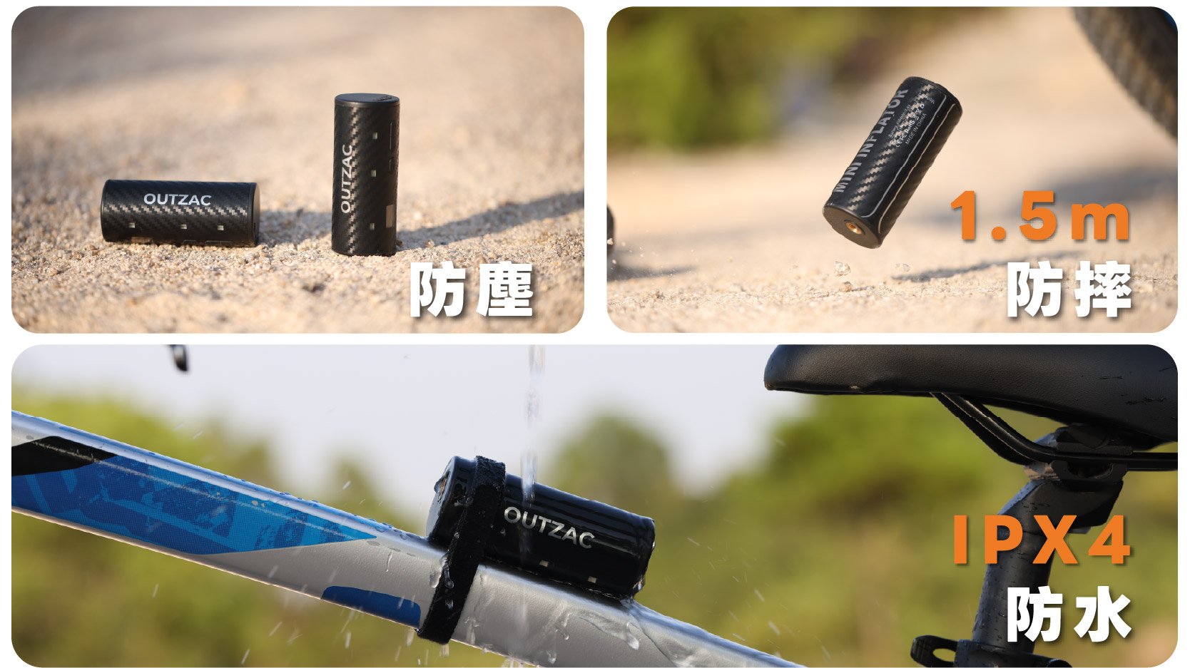 OUTZAC 不只輕巧,更堅固耐用。具備 IP 等級防護,可抵抗雨水、泥濘與灰塵,強化機身則能抵禦衝擊與摔落。無論您的騎乘帶您前往何處,它都能應對嚴峻環境。