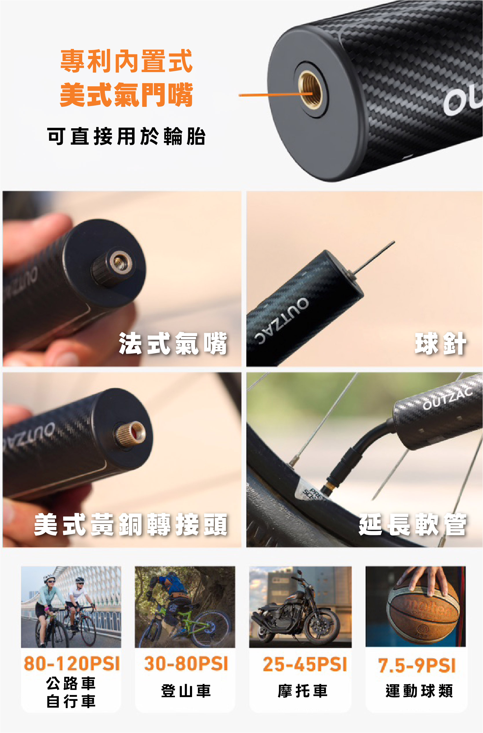 OUTZAC 充氣泵配備專利內建美式氣嘴,完整支援法式與美式氣嘴規格,適用於高壓公路車輪胎、寬幅登山車輪胎及日常通勤自行車。