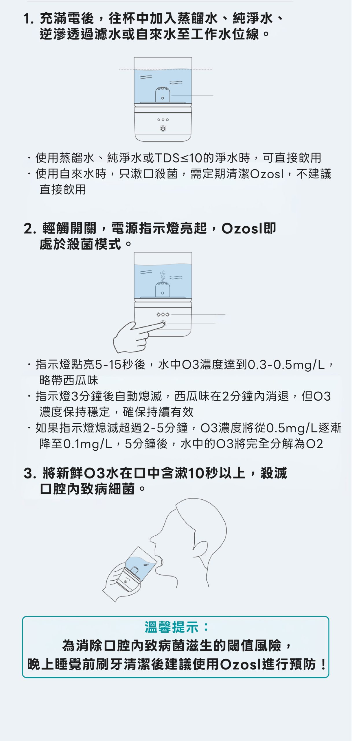 A:啟動5-15秒後,水中O3濃度即可達到0.3-0.5mg/L。