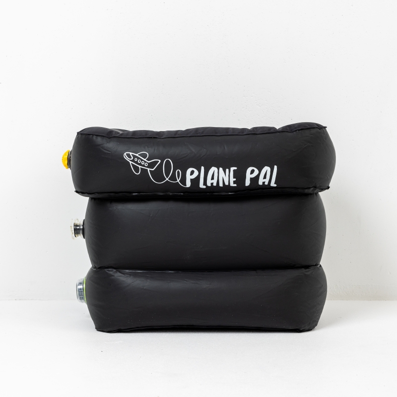 定製設計的Plane Pal充氣墊是為了坐飛機時,把孩子(或大人)的座椅和前面乘客座椅之間的空間填補充。