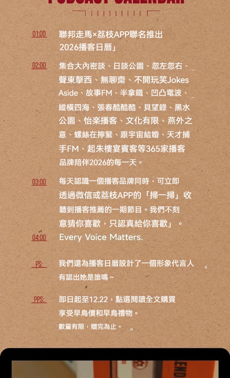 搶先留言 “播客日曆2026年機械回車解壓文藝台曆(品牌直送)”