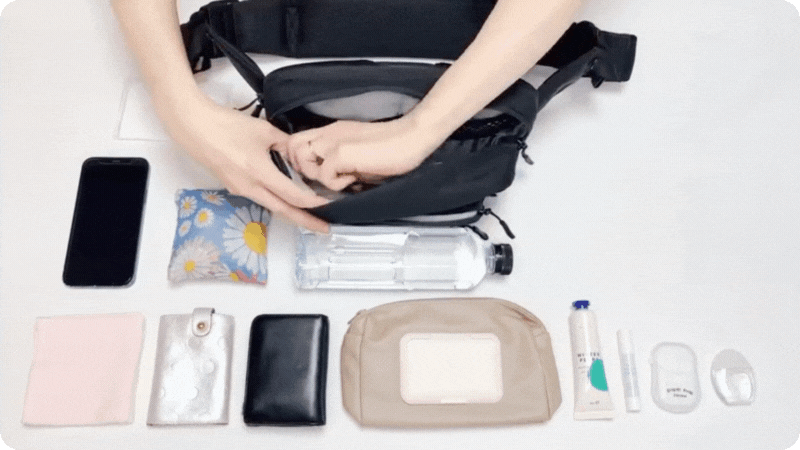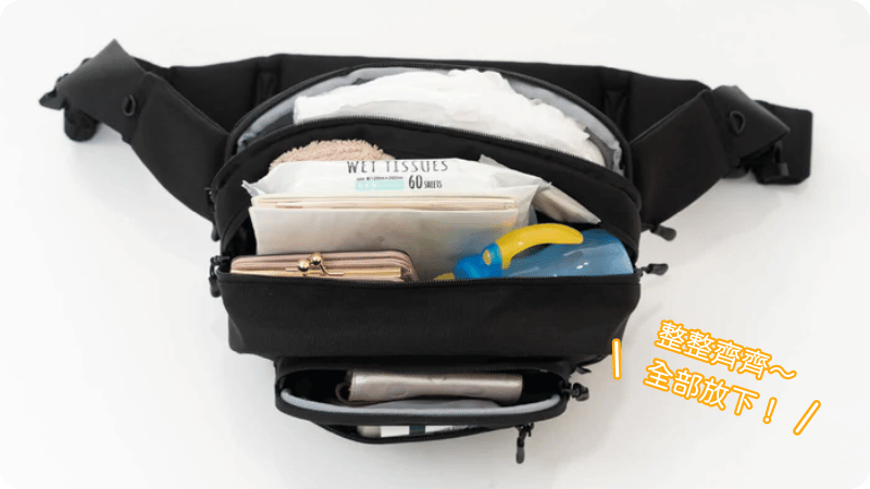 ▼ 主口袋超大容量,可以容納500毫升的寶特瓶、錢包、和濕紙巾等等