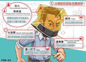 • 本頭罩無法主動提供氧氣,在氧氣不足的環境中戴上頭罩請立刻逃生
