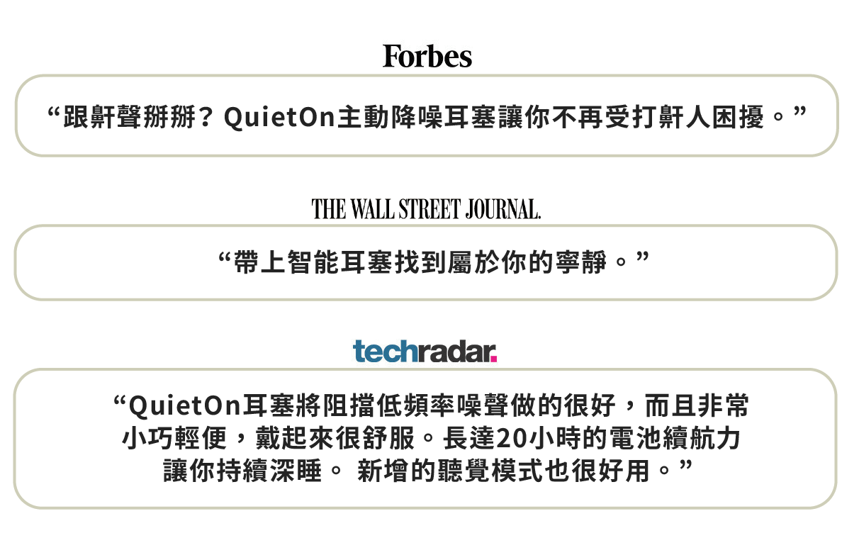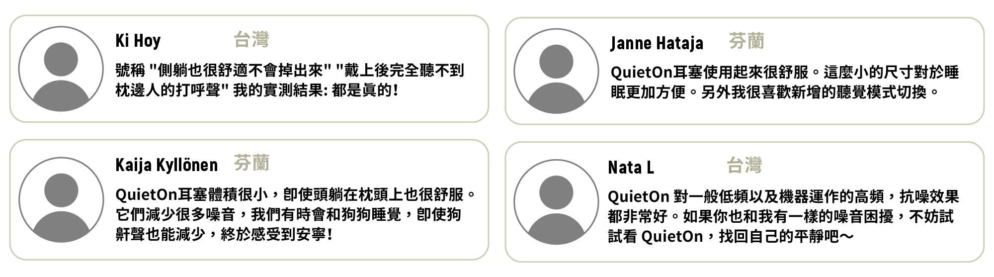 “當然!無論是鄰街喇叭聲、樓上隔壁敲擊聲、我先生的鼻鼾聲,戴上QuietOn好眠耳塞都能有效阻隔噪音,讓我一夜好眠!”