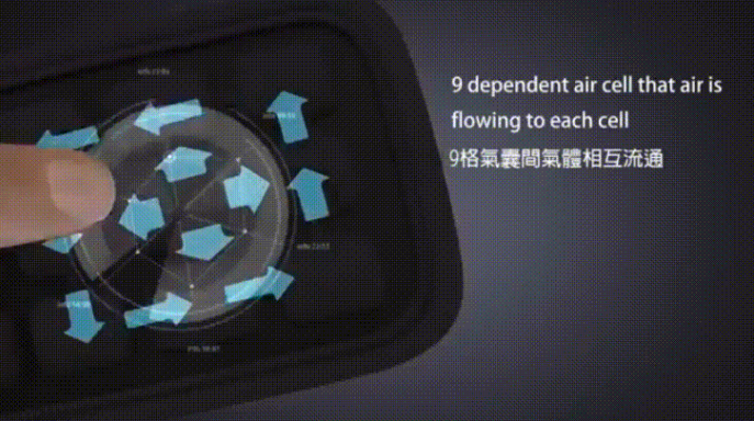 共通氣囊之間以「9」個為單位,包袋的重量擠壓氣囊,讓每單位內氣囊的氣裡相互流動,