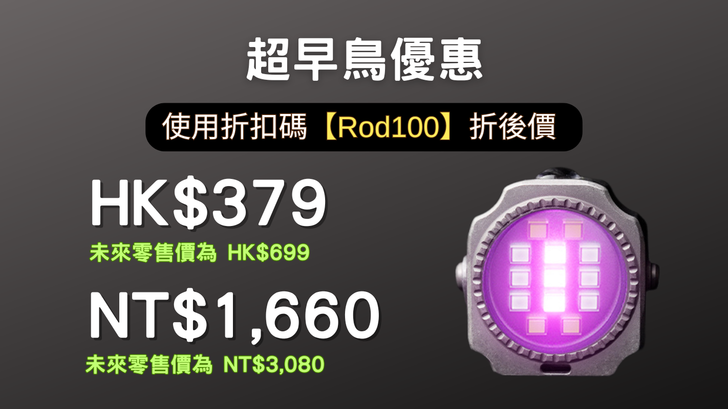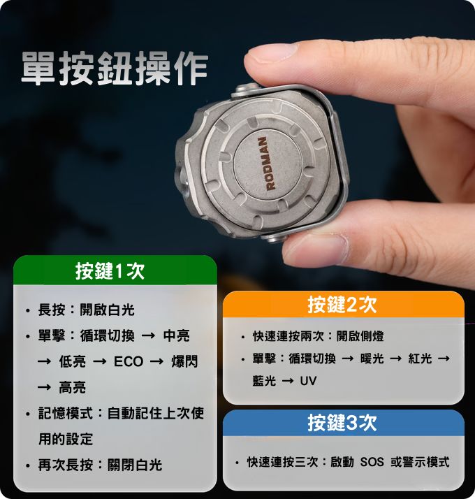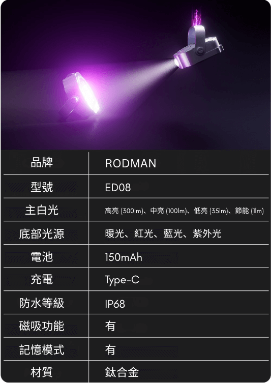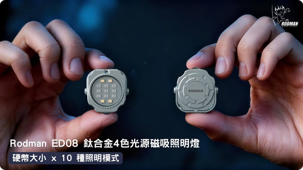 Rodman ED08 手電筒是一款小巧的硬幣大小多功能手電筒,採用 GR5 鈦合金打造。它配備五種 LED 燈珠顏色和 10種照明模式,可滿足各種場合的照明需求。