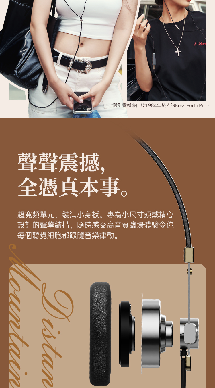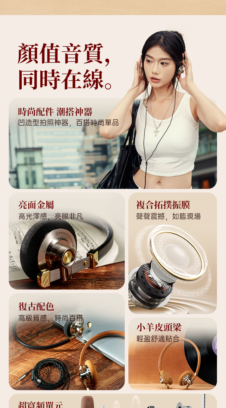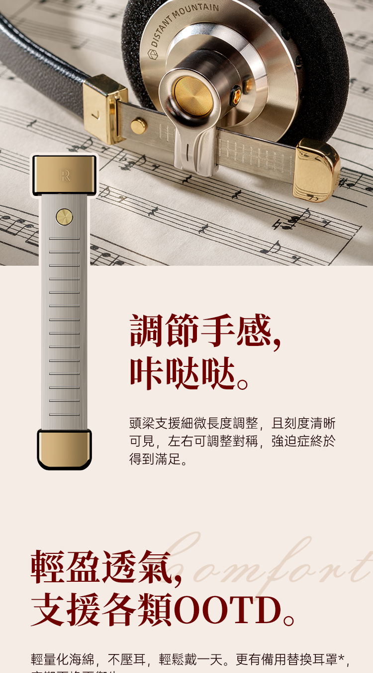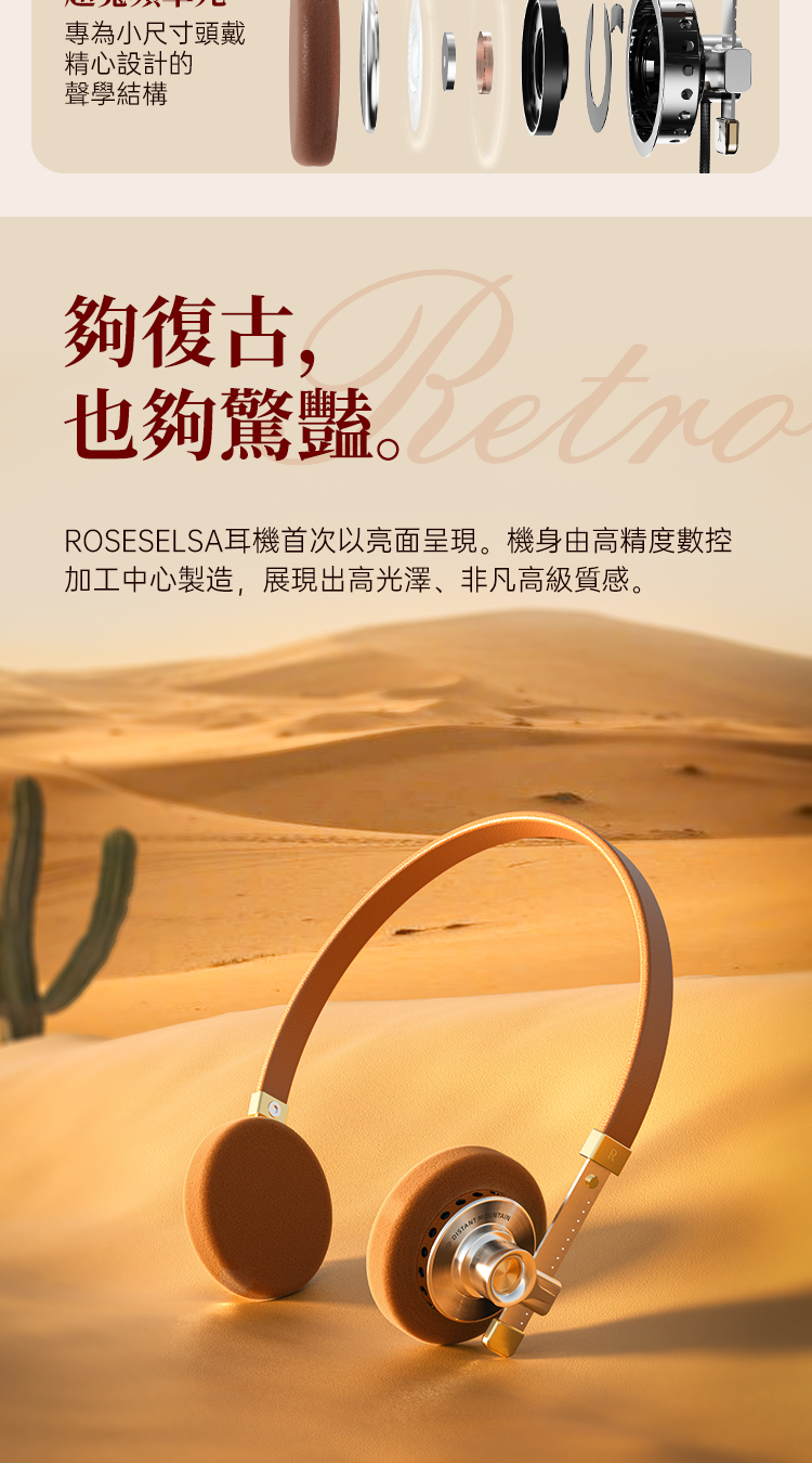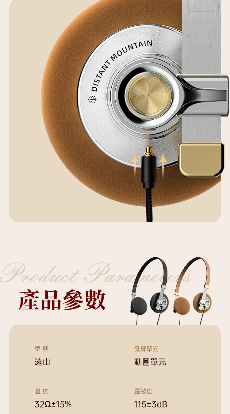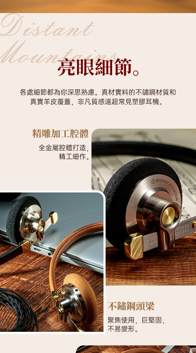 Distant Mountain 是ROSESELSA耳機系列中首次採用亮面金屬設計的一款復古頭戴產品,機身由高精度數控加工中心製造,結合高光澤感金屬工藝,整體堅固耐用。腔體採用全金屬材質,通過精細加工工藝確保產品的高精度與穩定性。頭梁部分使用小羊皮包裹,質地柔軟,重量輕盈,與頭部貼合良好,同時採用不鏽鋼框架,保證頭梁的強度和耐久性,不易變形。