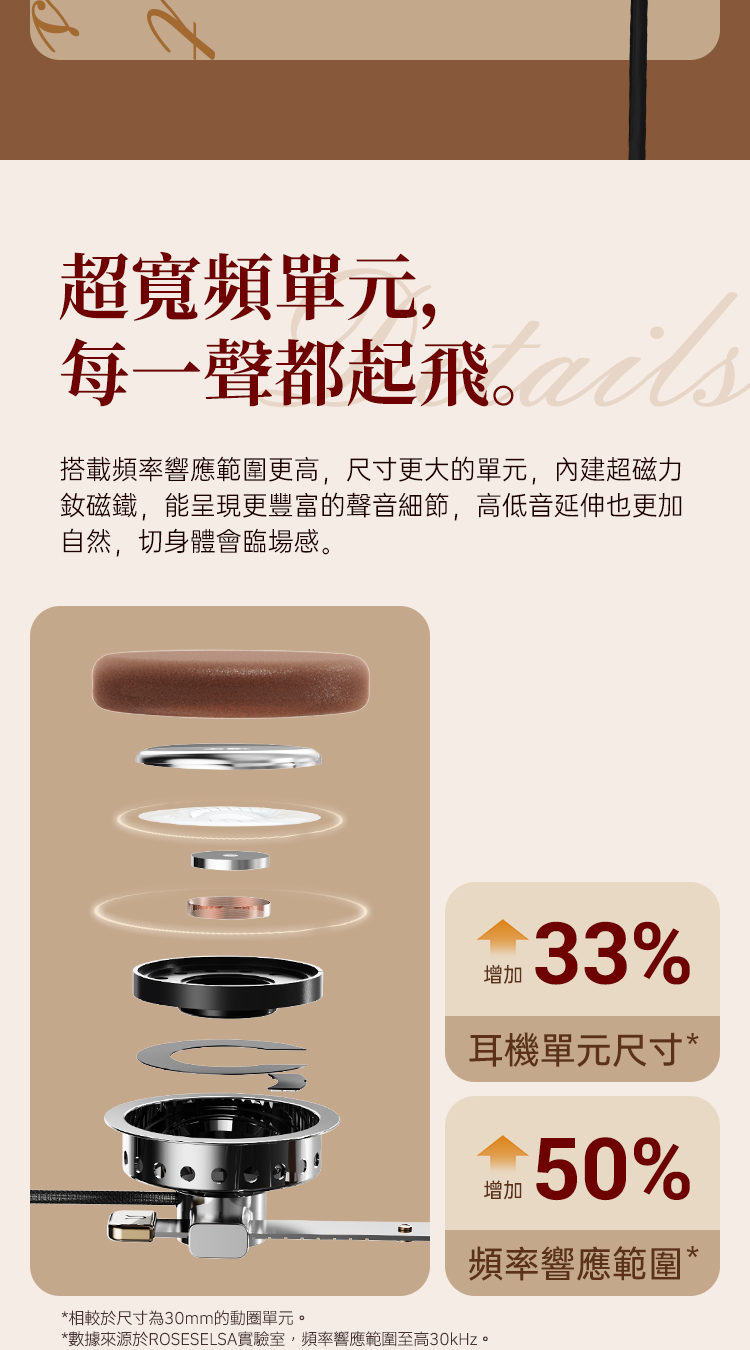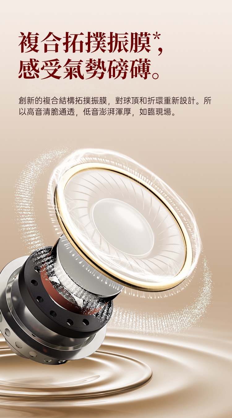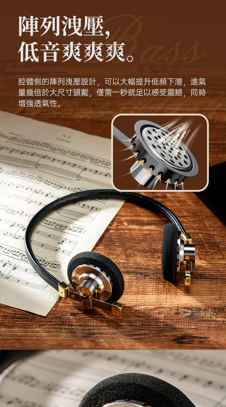 耳機搭載超寬頻單元,頻率響應範圍從 20Hz 提升至 30kHz,覆蓋範圍比傳統單元提升 50%。單元尺寸增加至 30mm 或 40mm。結合超磁釹磁鐵的應用,可以展現更多的聲音細節,並提供自然的高低頻延伸。複合拓撲振膜在球頂和折環設計上進行了改良,高頻清晰通透,低頻強勁飽滿。腔體的陣列泄壓設計進一步提升了低頻的表現能力,同時增強透氣性,適合長時間使用。