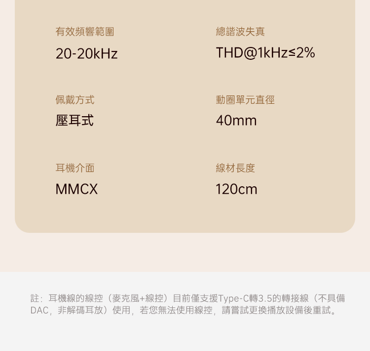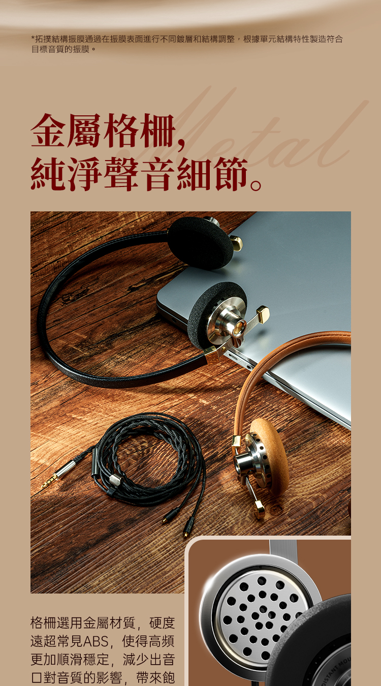耳機的金屬格柵採用高強度材質,替代常見的 ABS 材質,能夠減少音質受到出音口乾擾的影響,使高頻表現更加穩定。頭梁支持微調長度,刻度清晰,左右調節對稱,方便用戶根據個人需求調整佩戴效果。耳墊使用輕量化海綿材料,減輕耳部壓力,佩戴更加舒適。耳機標配 MMCX 可換線接口,搭配 5N 單晶銅線材。停止播放時,也能聽到外界的聲音。