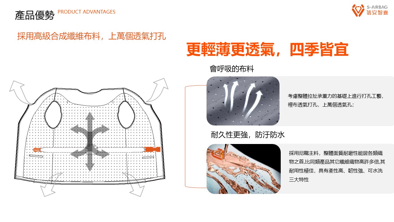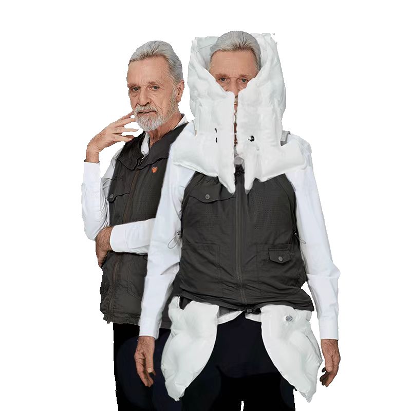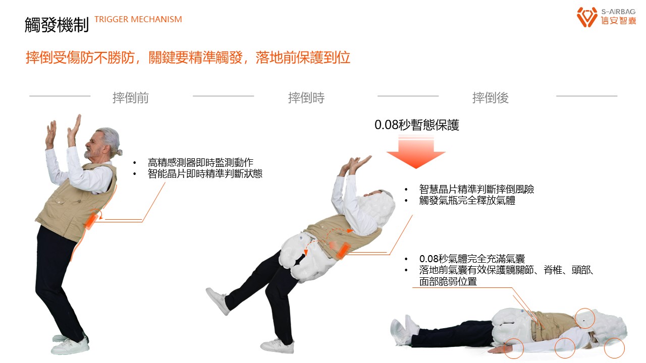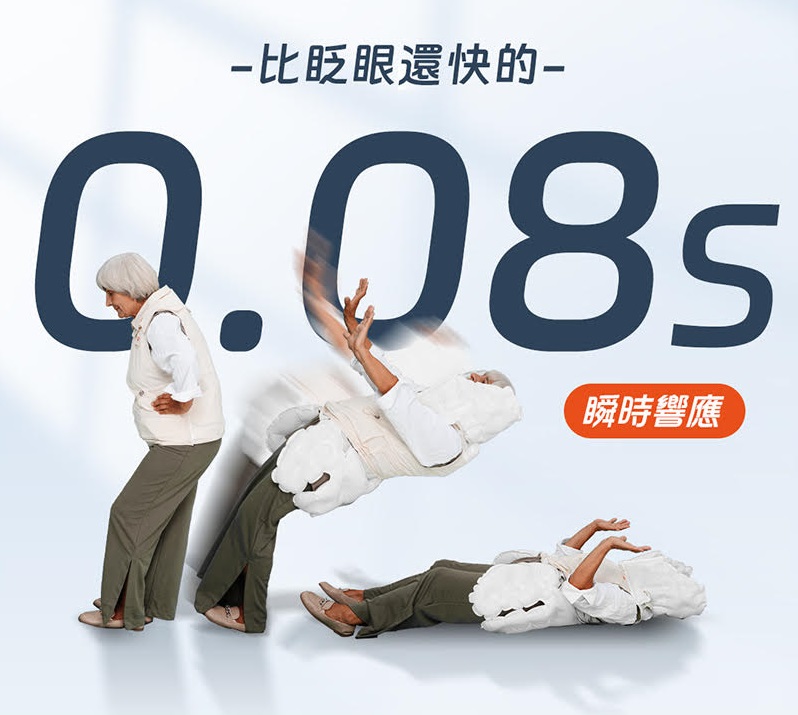 智能防摔背心採用高精度微型感測器和超智能AI技術,經過數十萬次測試,能在0.08秒內瞬間精準預測摔倒,啟動氣囊提供即時保護。