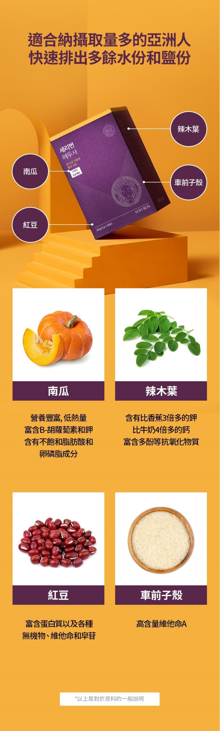 • 南瓜、辣木葉、紅豆、車前子殼、玉米鬚、有機仙人掌和朝鮮王朝實錄中記載的當歸、黃芪、蒼朮、茯苓、扁豆、白術等