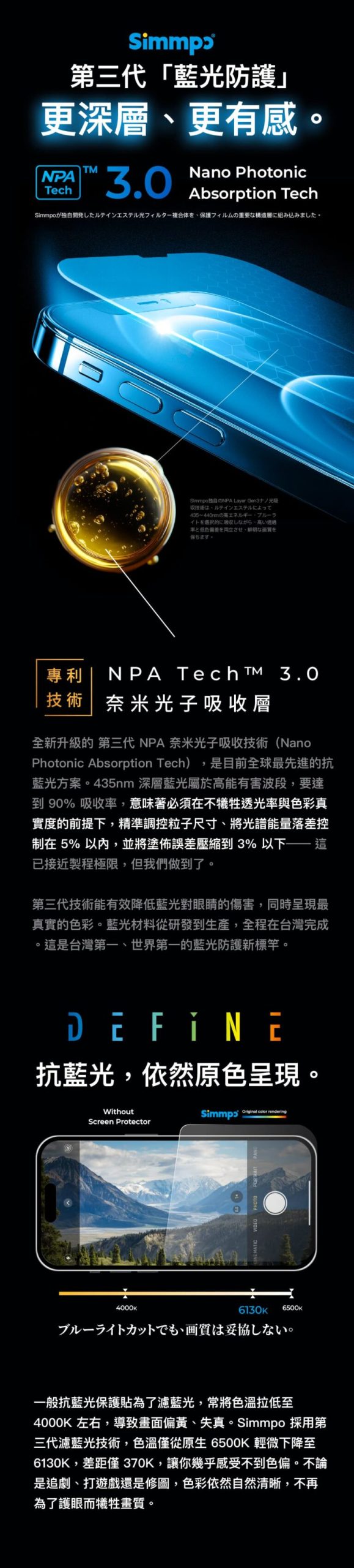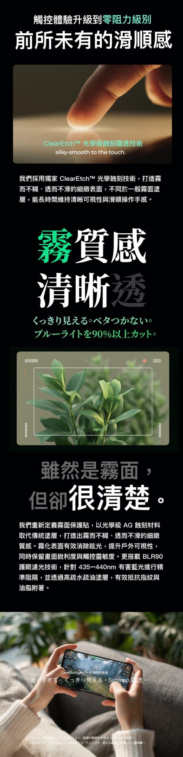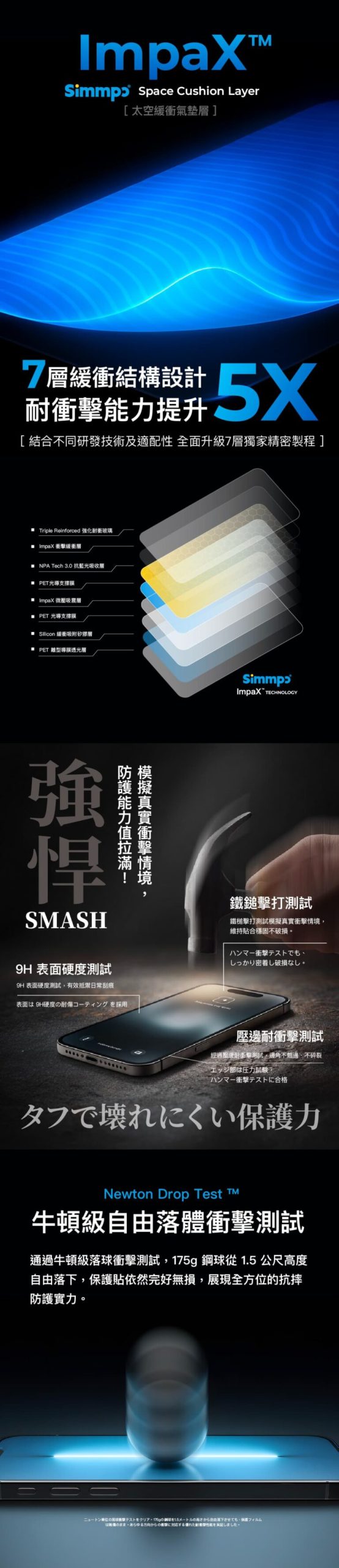 1. 採用高鋁玻璃 + 三次化學強化2. 疏油水鍍膜水滴角 高達 114 度3. 多層緩衝結構,更耐撞與耐摔4. 抗菌塗層處理,抗菌率高達95%以上5. 通過耐候性測試,在高溫80º、低溫-20º及85%高濕度下仍可保持產品穩定度