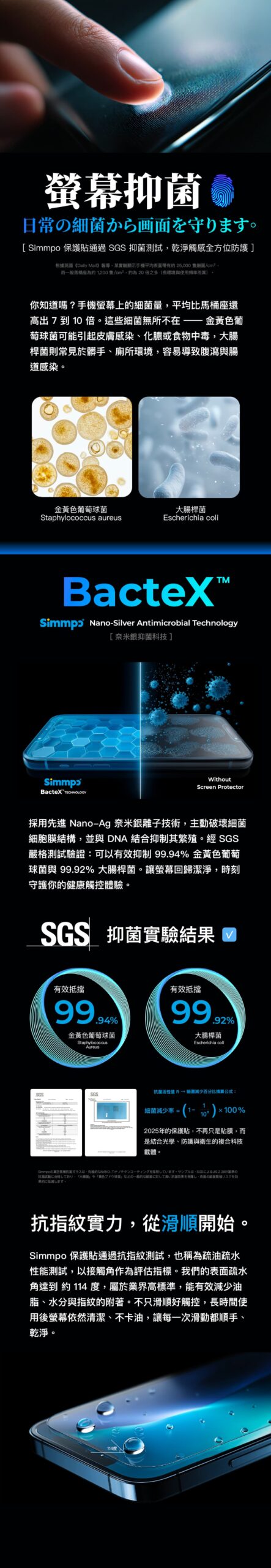 1. 採用高鋁玻璃 + 三次化學強化2. 疏油水鍍膜水滴角 高達 114 度3. 多層緩衝結構,更耐撞與耐摔4. 抗菌塗層處理,抗菌率高達95%以上5. 通過耐候性測試,在高溫80º、低溫-20º及85%高濕度下仍可保持產品穩定度