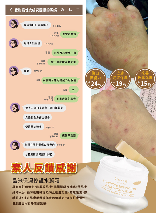 晶米保濕修護水凝霜具有良好保濕力,能柔軟肌膚、修護肌膚及補水,使肌膚維持水分,預防肌膚乾燥及防止肌膚粗糙,有效滋潤、修護肌膚,提升肌膚對環境傷害的保護力、恢復肌膚彈性,使肌膚由內而外恢復光澤。