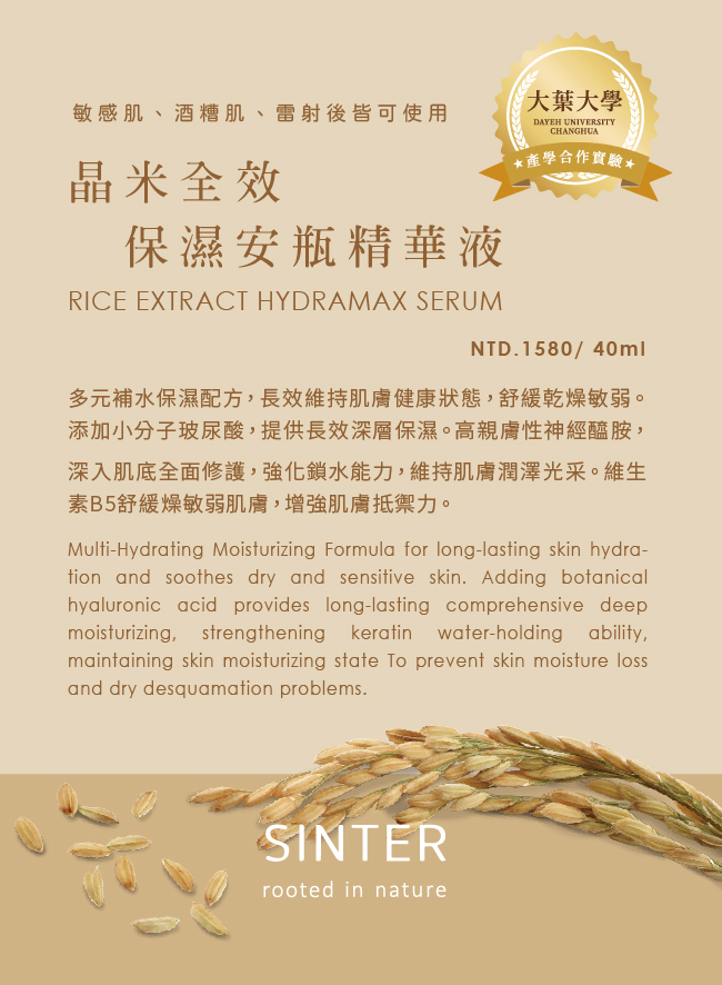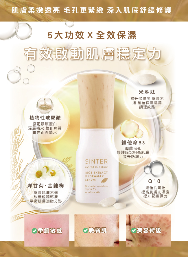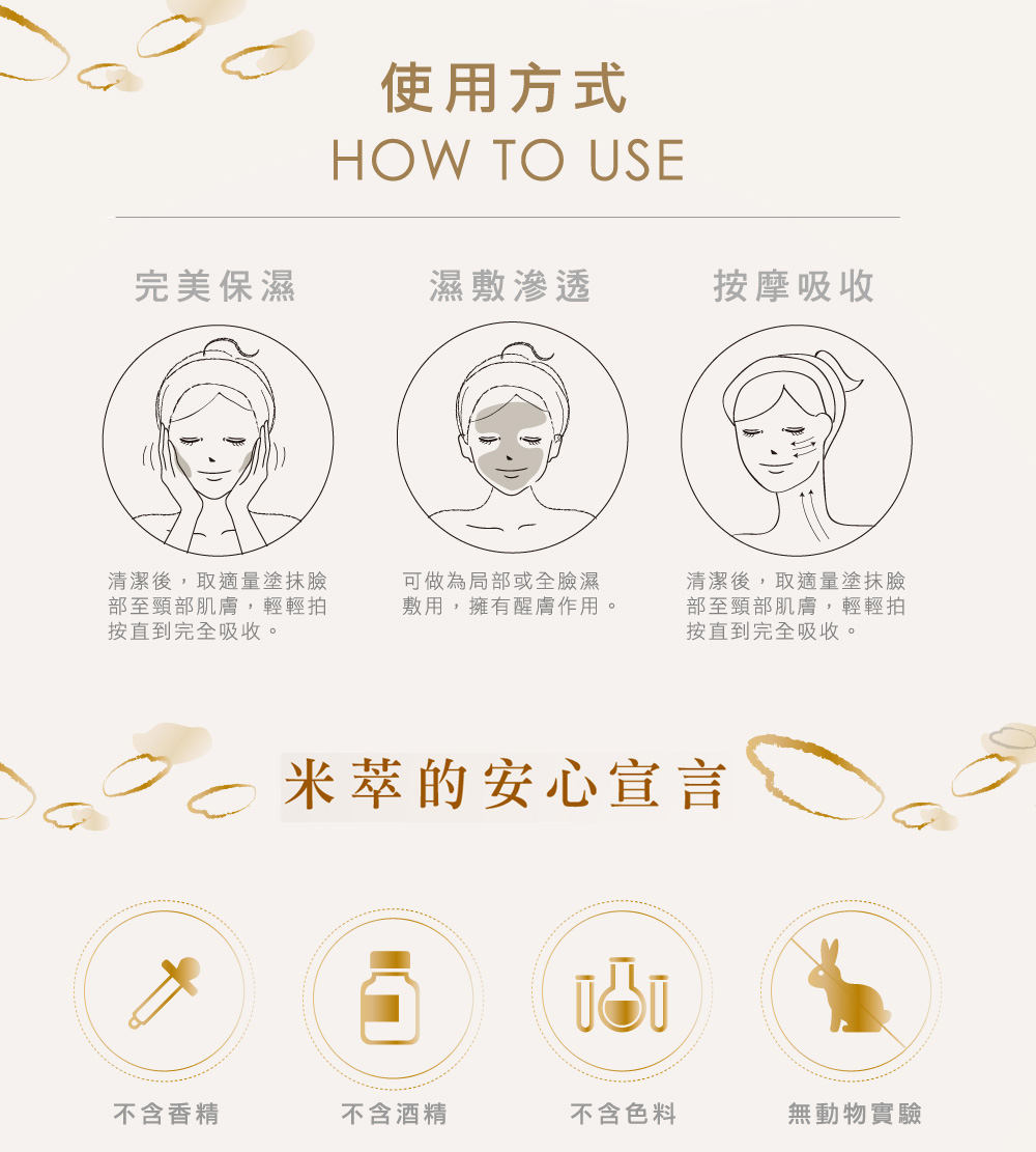 補水保濕、舒緩修護、緊緻延緩肌膚老化、提亮肌膚、細緻毛孔五大功效,無香料色素 添加。