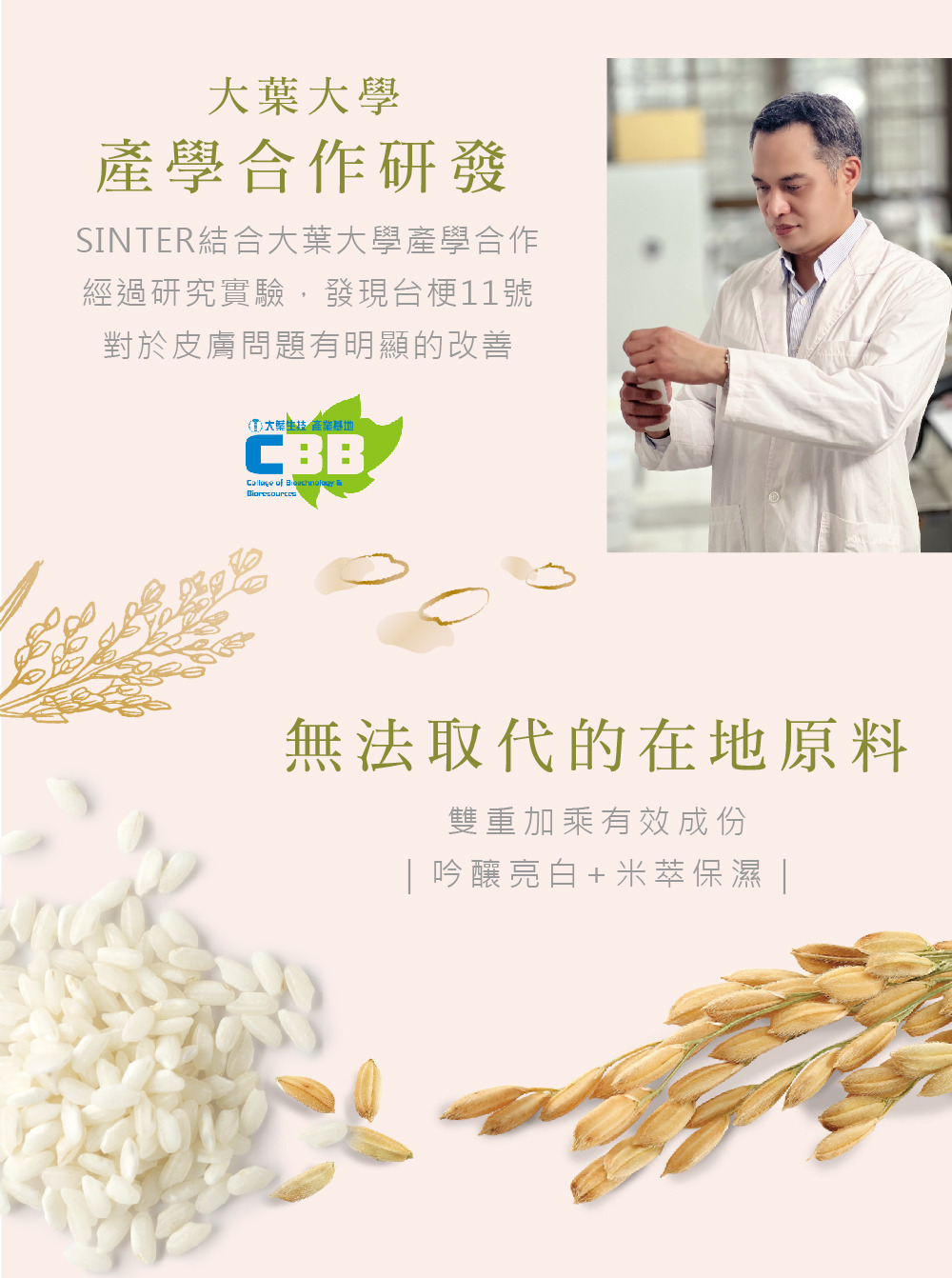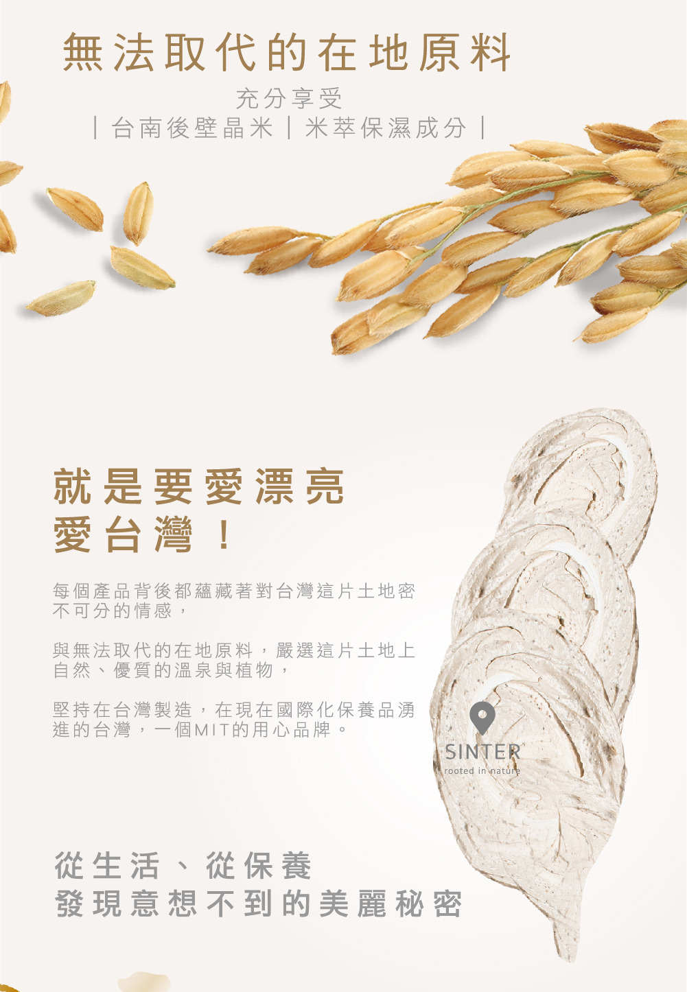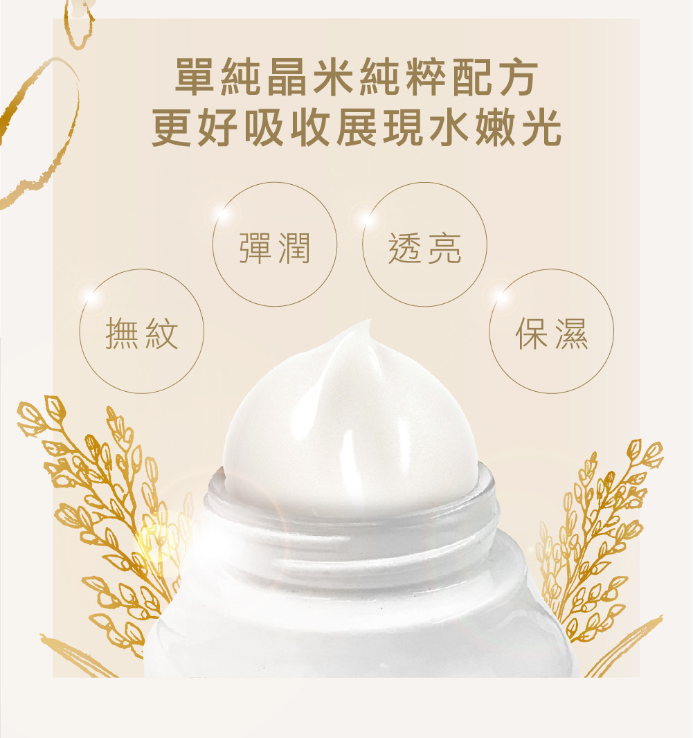 晶米系列取自無農藥、無工業污與土壤優質的後壁晶米之萃取物。全新配方加入米胜肽技術,先利用超音波萃取技術,以最佳萃取條件有效完整萃取米蛋白 再利用酵素水解技術將米蛋白水解成優質米胜肽,強化肌膚屏障,綻放水光肌。