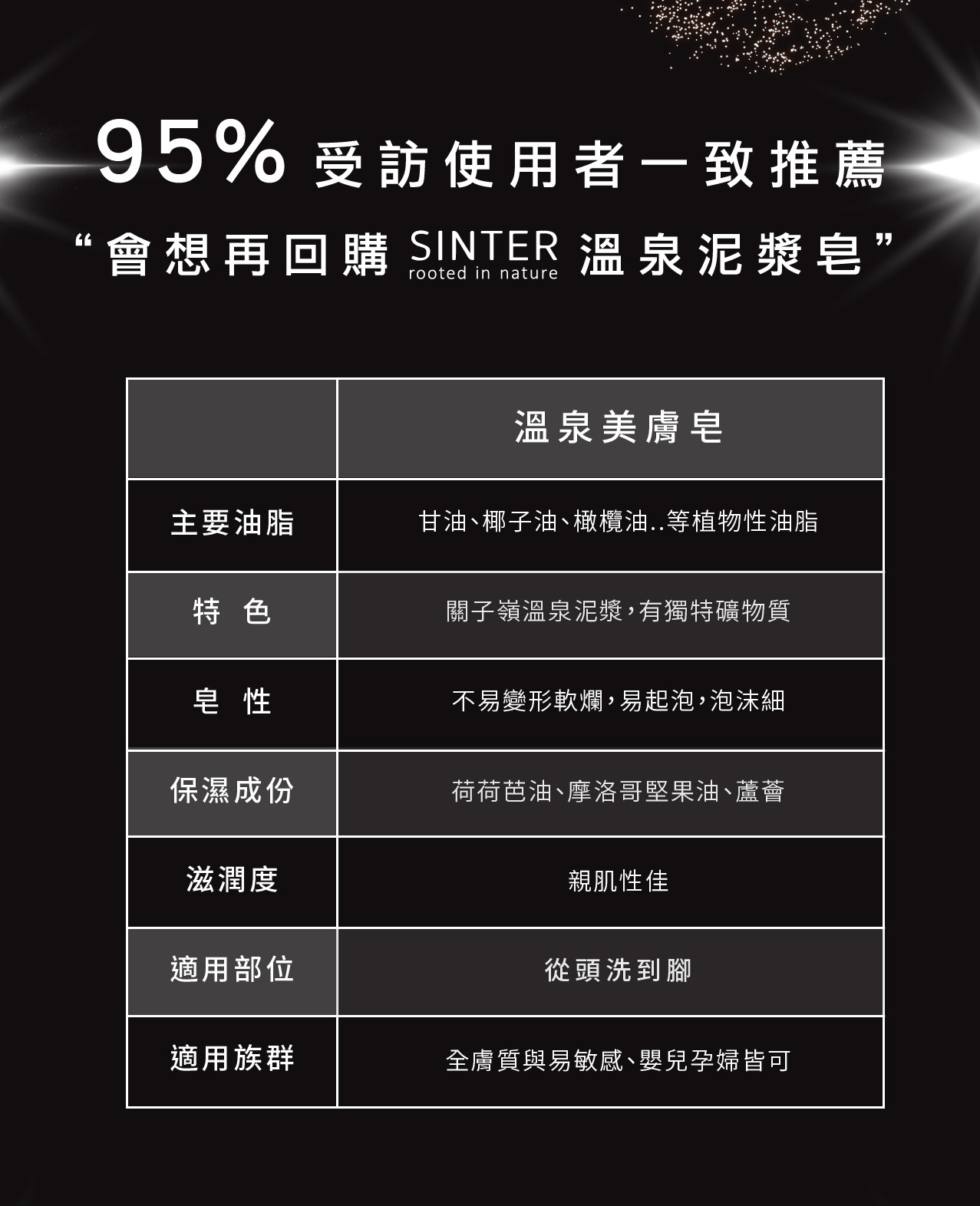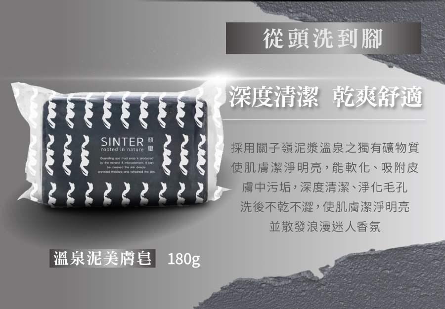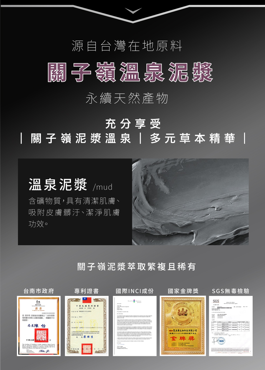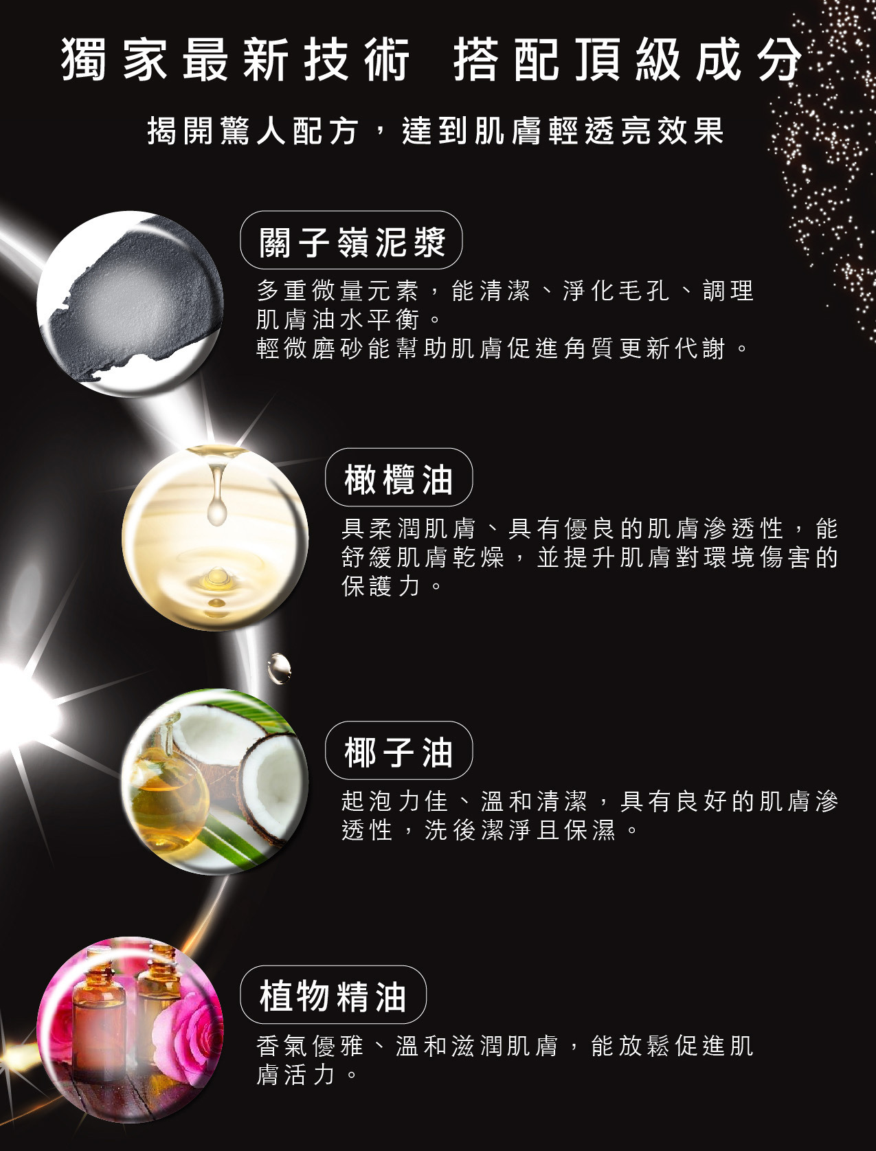 採用關子嶺泥漿溫泉之獨有礦物質,使肌膚潔淨明亮,能軟化、吸附皮膚中污垢,深度清潔、淨化毛孔,幫助肌膚代謝老廢角質,泡沫細緻,享受真正的無感潔淨,洗後不乾不澀,使肌膚潔淨明亮並散發浪漫迷人香氛。