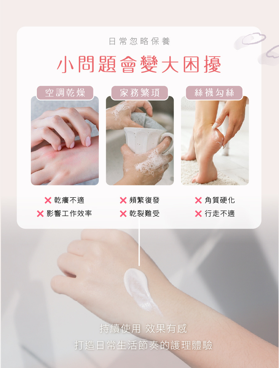 溫柔滋養每一寸肌膚,深度修護雙手與足部乾燥、粗糙問題。適合手、足部位的潤澤保養,敏感肌也能安心使用!