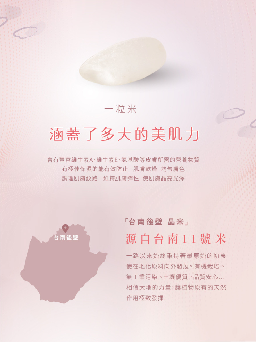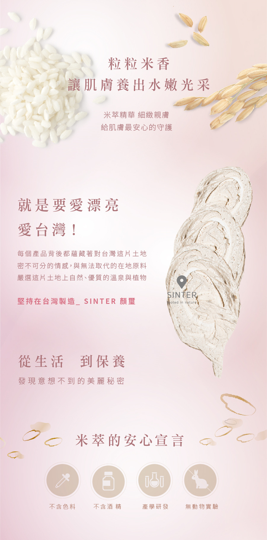 採用天然米萃精華,溫和親膚,無添加刺激性化學物質,適合各類膚質,連敏感肌也能安心使用!