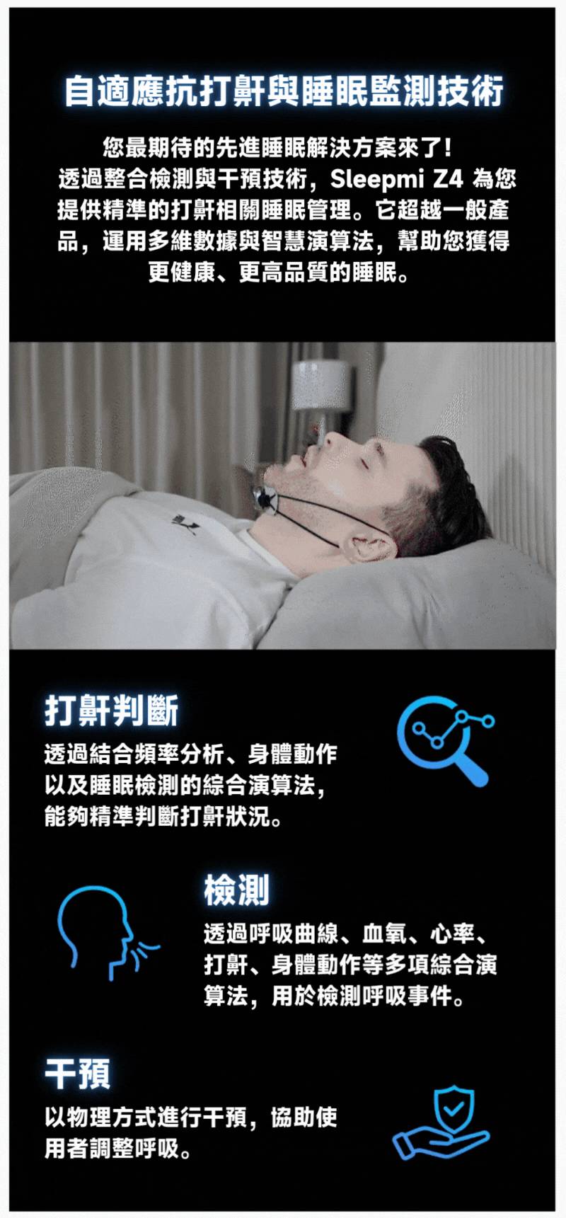 Sleepmi Z4 能即時追蹤呼吸曲線,並透過血氧、心率等多重數據進行綜合分析,判斷是否出現呼吸暫停。