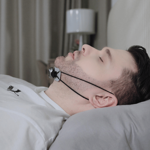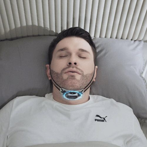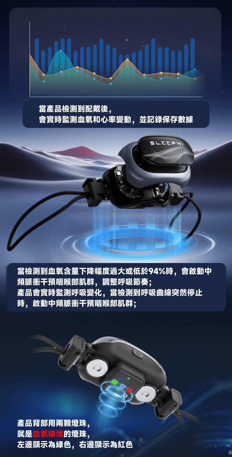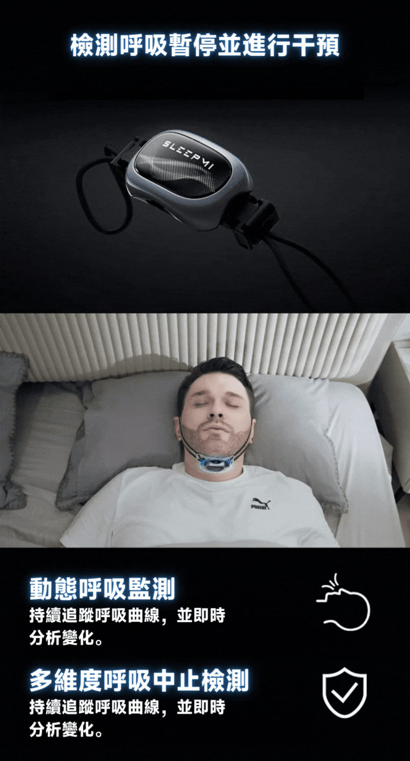 A: 本產品透過AI辨識演算法及高精度感測器,精準辨識打鼾,監測呼吸曲線變化,結合血氧、心率等指標,全面判斷睡眠呼吸中止事件。當偵測到打鼾或呼吸暫停時,會以不同強度的脈衝刺激咽喉肌肉,調整呼吸節律,使呼吸更加順暢。