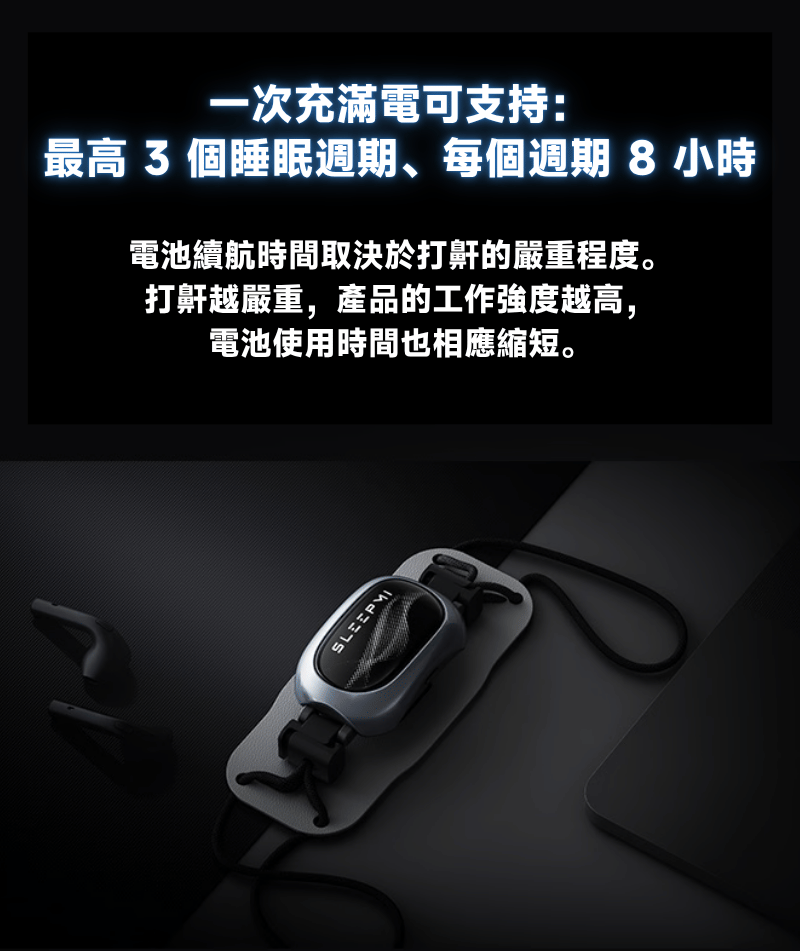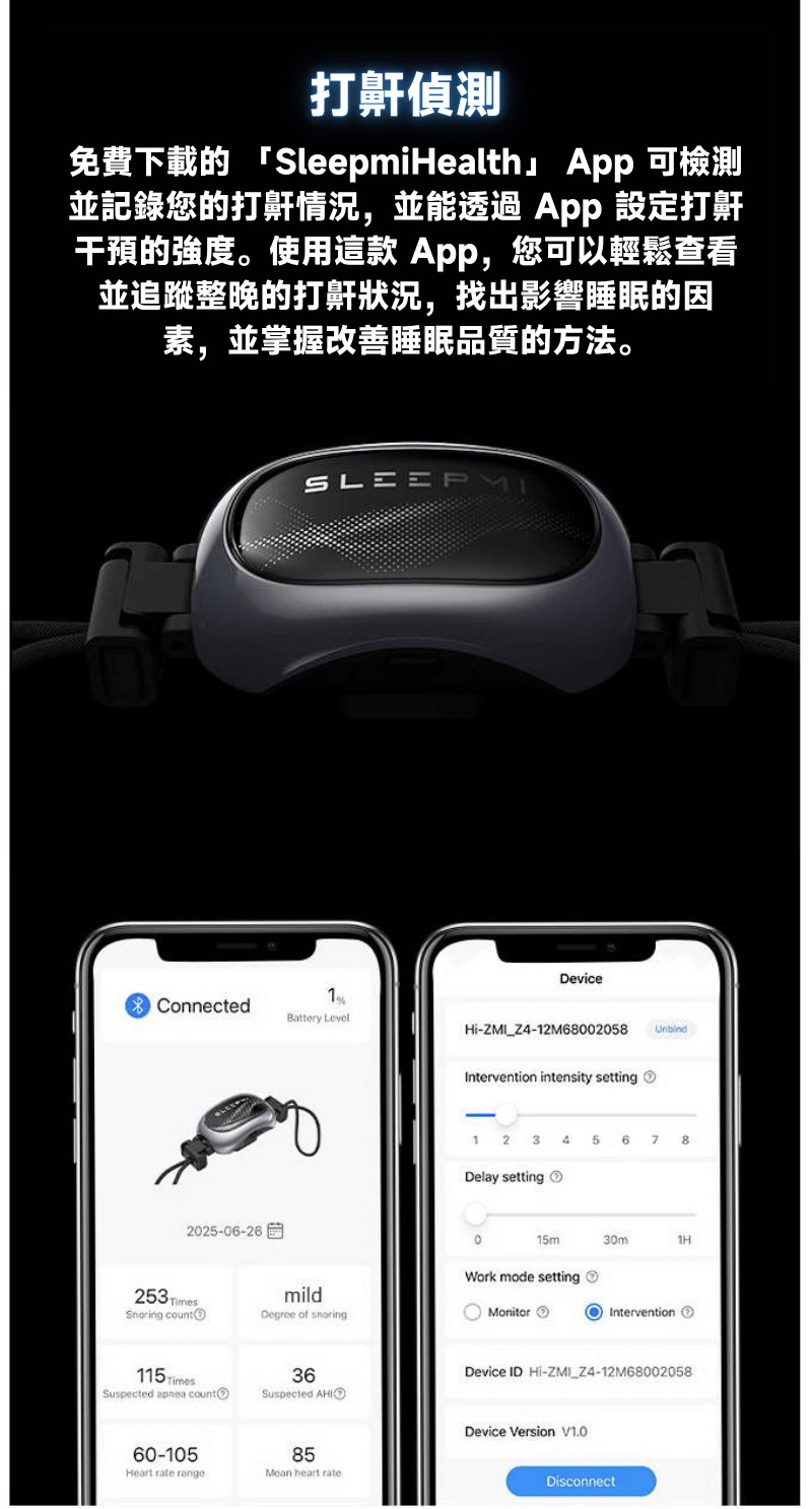 Sleepmi 是一款基於人工智慧技術,專為改善睡眠問題而設計的智慧型裝置。與市面上常見的產品不同,它採用了更精準可靠的鼾聲檢測方法——並非透過語音辨識(容易受環境噪音影響而誤判),而是透過捕捉鼾聲頻率,結合體能、睡眠偵測等多維度數據,透過綜合演算法精準判斷鼾聲狀況。