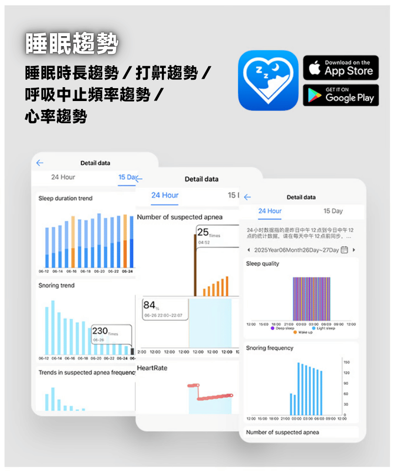 A: APP可以顯示您使用後的打鼾數據、產品工作數據、睡眠數據、血氧、心率、睡眠呼吸中止相關數據。