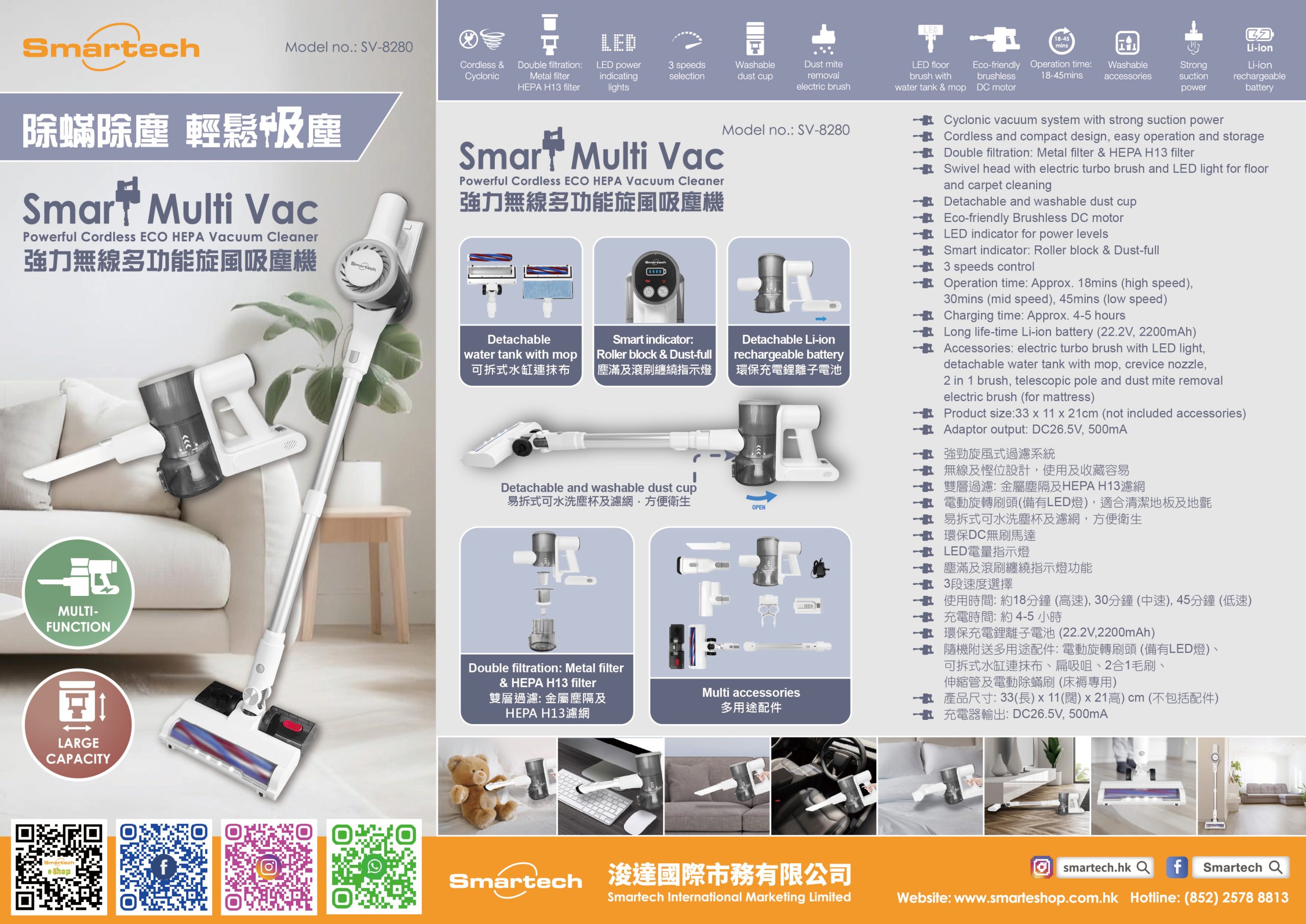 隨機附送多用途配件: 電動旋轉刷頭 (備有LED燈)、可拆式水缸連抹布、扁吸咀、2合1毛刷、伸縮管及電動除蟎刷 (床褥專用)