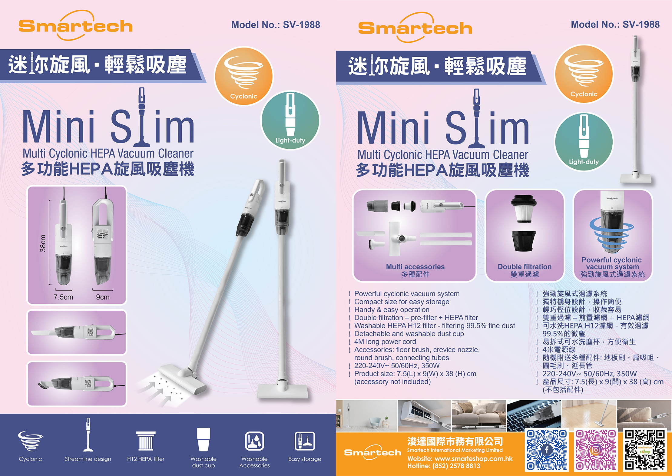 – 隨機附送多種配件: 地板刷、扁吸咀、圓毛刷、延長管