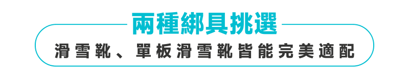 提供兩種綁具選擇:可調整的免工具單板滑雪或滑雪靴綁具,附有安全繩設計,確保固定穩固,並採用防滑表面,提供完美抓地力。不論你穿的是滑雪靴還是單板滑雪靴,單一尺寸設計皆能完美兼容,輕鬆上腳,即刻享受滑行樂趣🤟