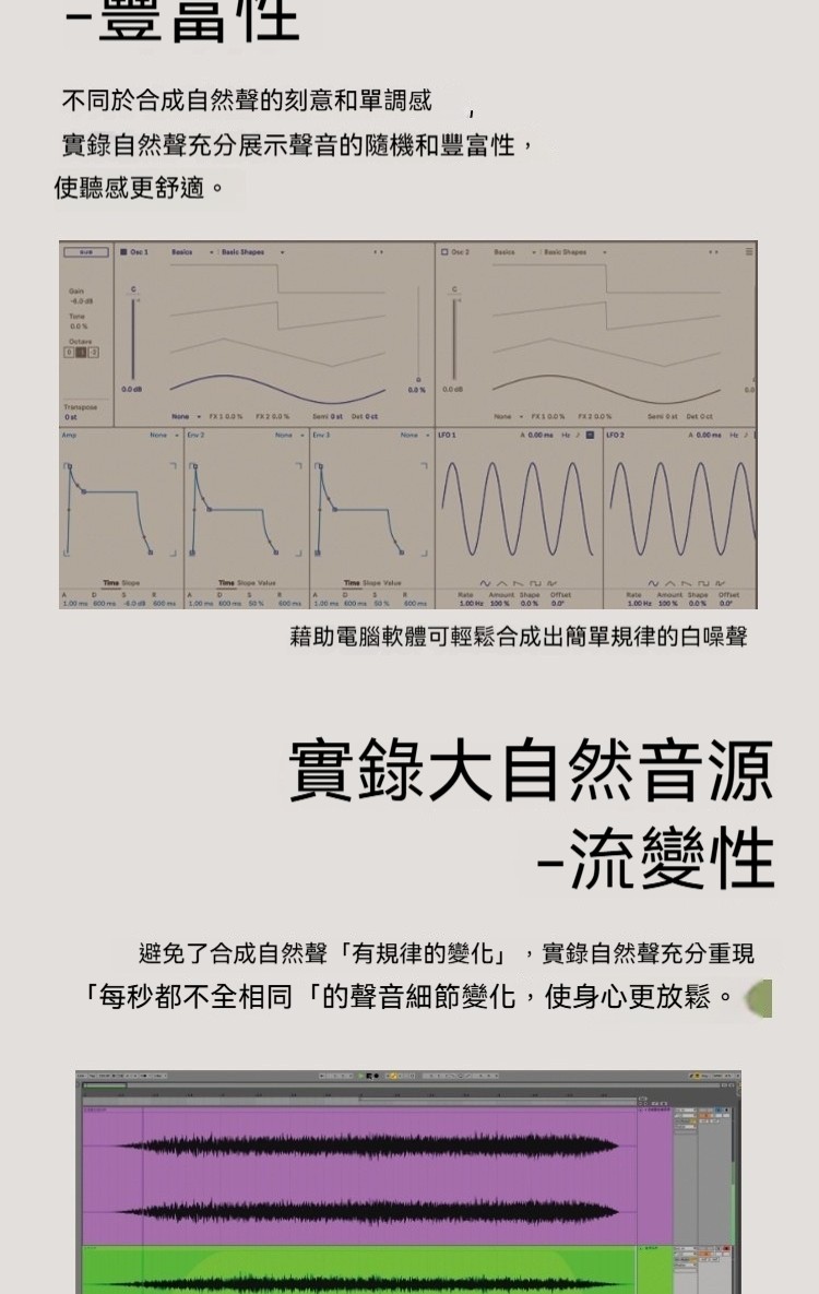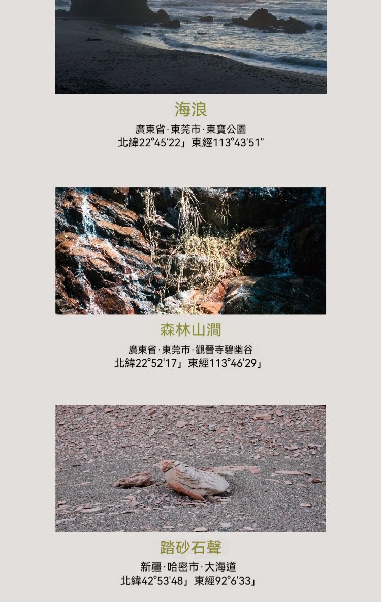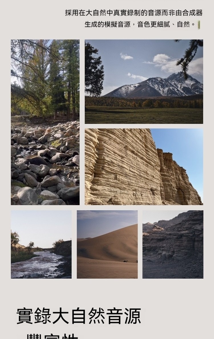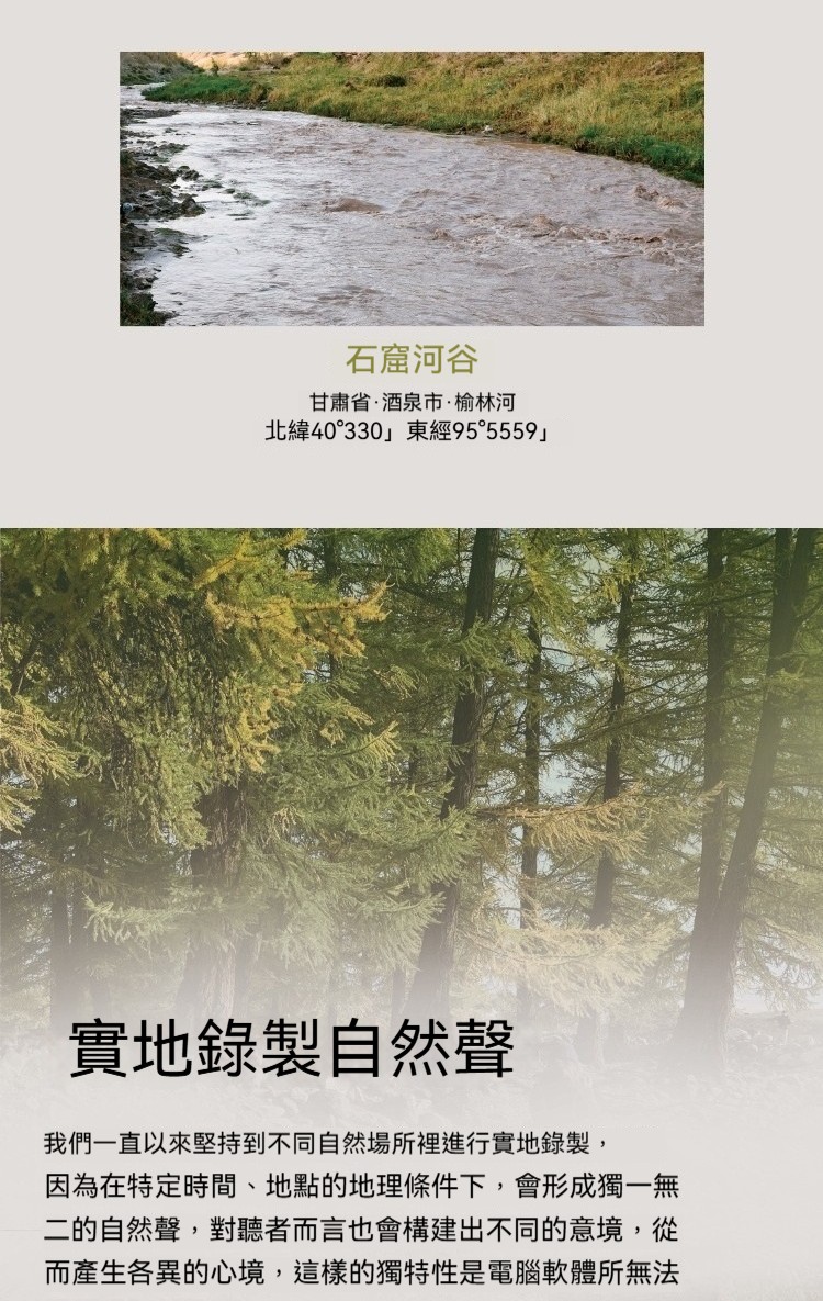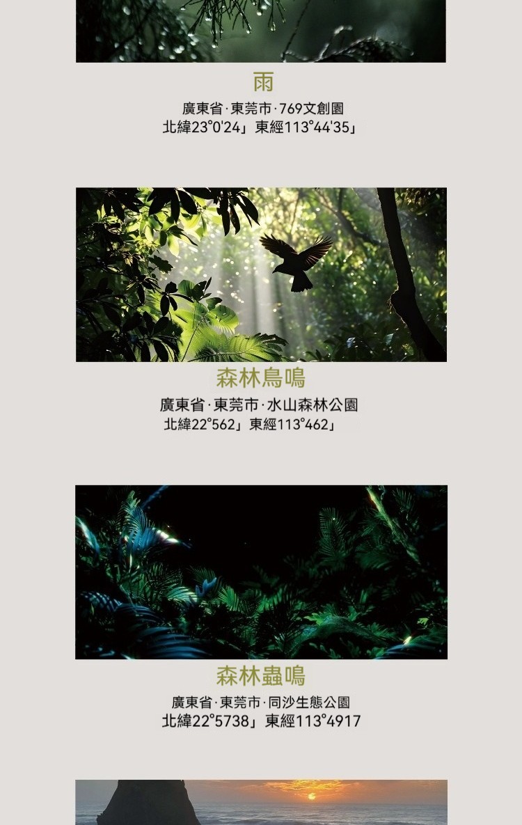 冰川溪流, 森林山澗, 森林蟲鳴, 森林鳥鳴, 海浪, 石窟河谷, 踏砂石聲, 雨聲