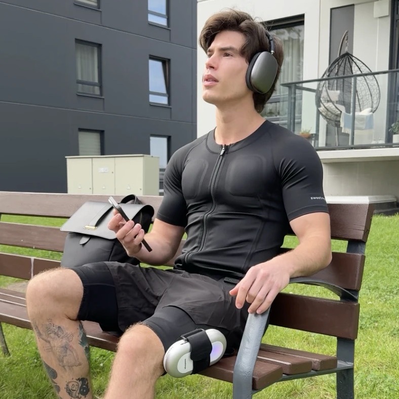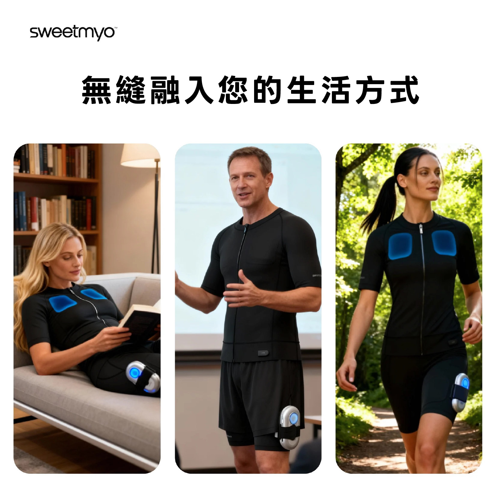 A:當然舒適,而且這是關鍵:Sweetmyo 配有專門設計的 Myosuit,一套穿戴式健身服,柔軟、透氣且富彈性,貼合如第二層肌膚。它不是穿在衣服裡面,它本身就是服裝。為日常舒適而設計,Myosuit 外觀與觸感都像時尚運動服,可在家中、工作時、休閒時或外出辦事時穿著(需要時可搭配外套或外層衣物)。