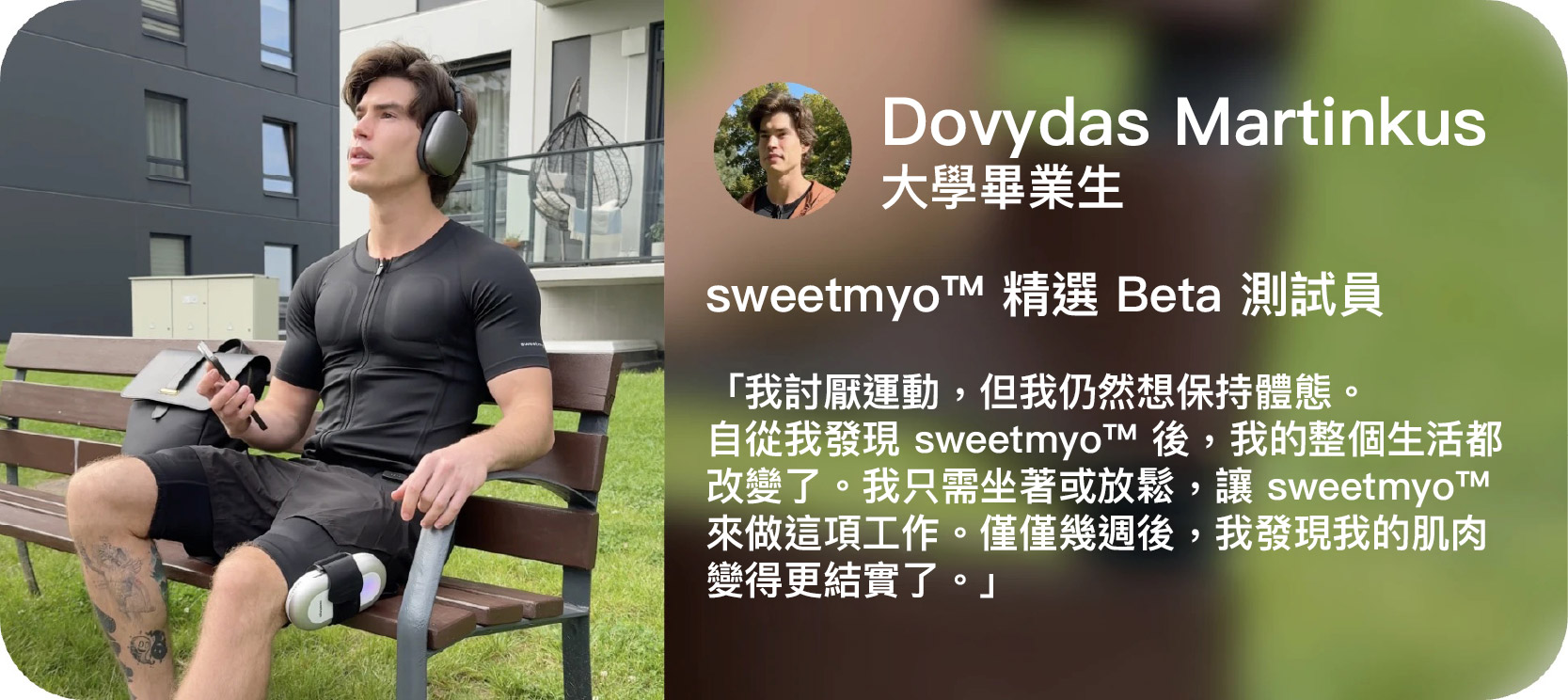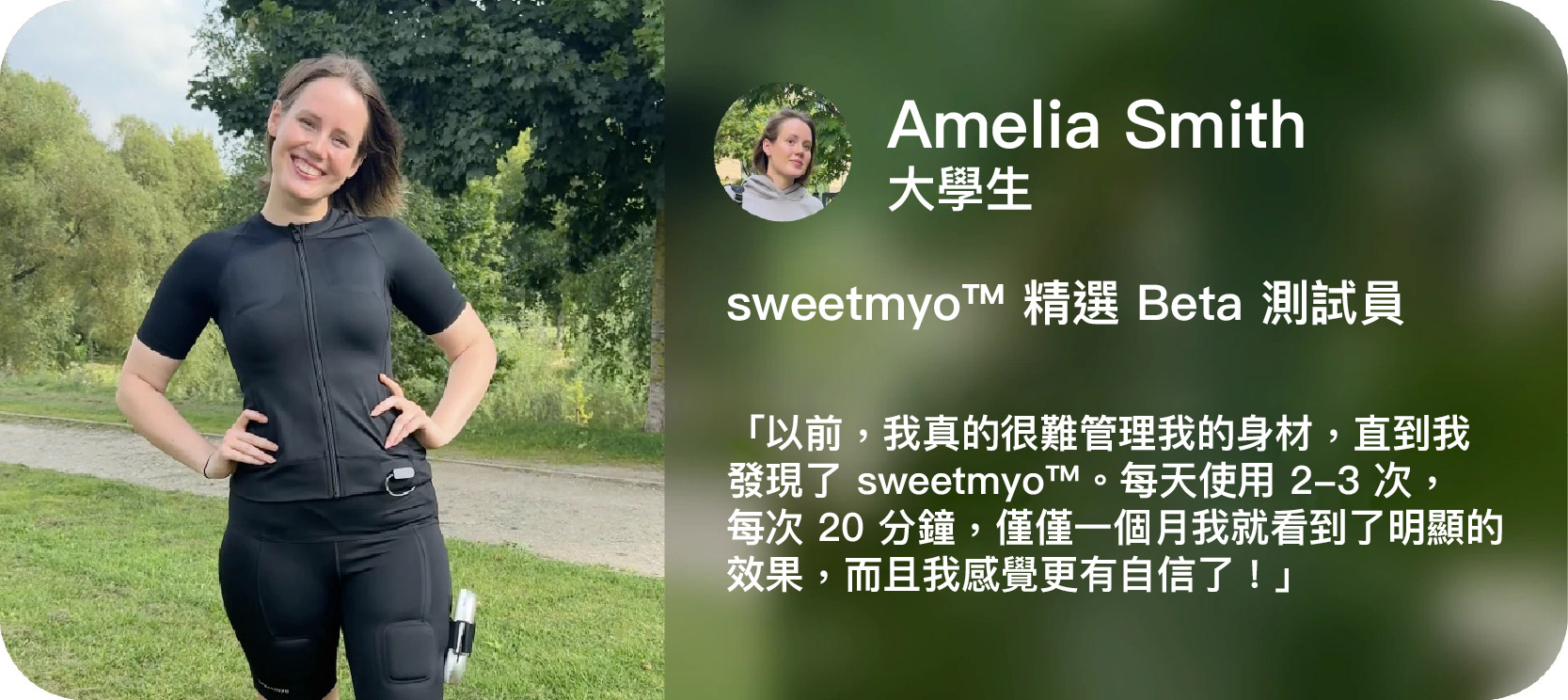 A:Sweetmyo 是一款穿戴式塑身衣,使用溫和刺激來啟動您的肌肉,無需任何動作。可以想像成一種被動式鍛鍊,您可以在坐著、滑手機甚至小睡時進行。使用臨床級技術,Sweetmyo 向您的肌肉群發送精準訊號以觸發低強度收縮——類似於運動時肌肉的活動方式,但無需費力。