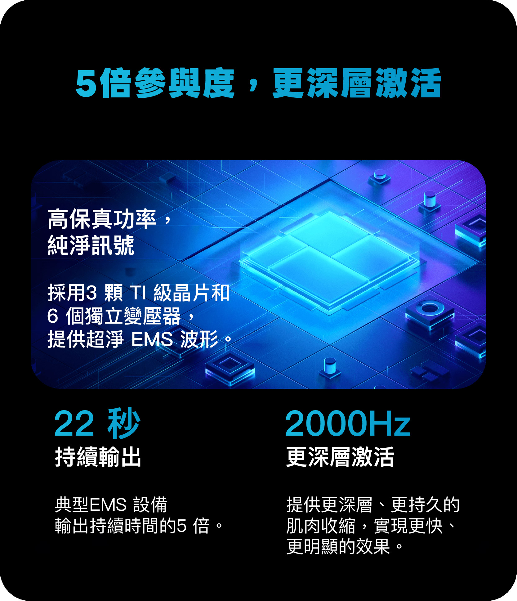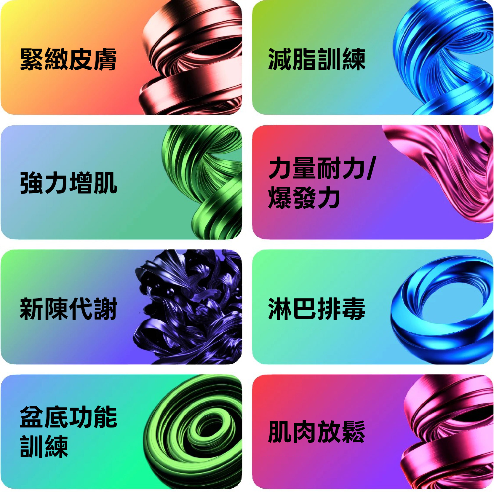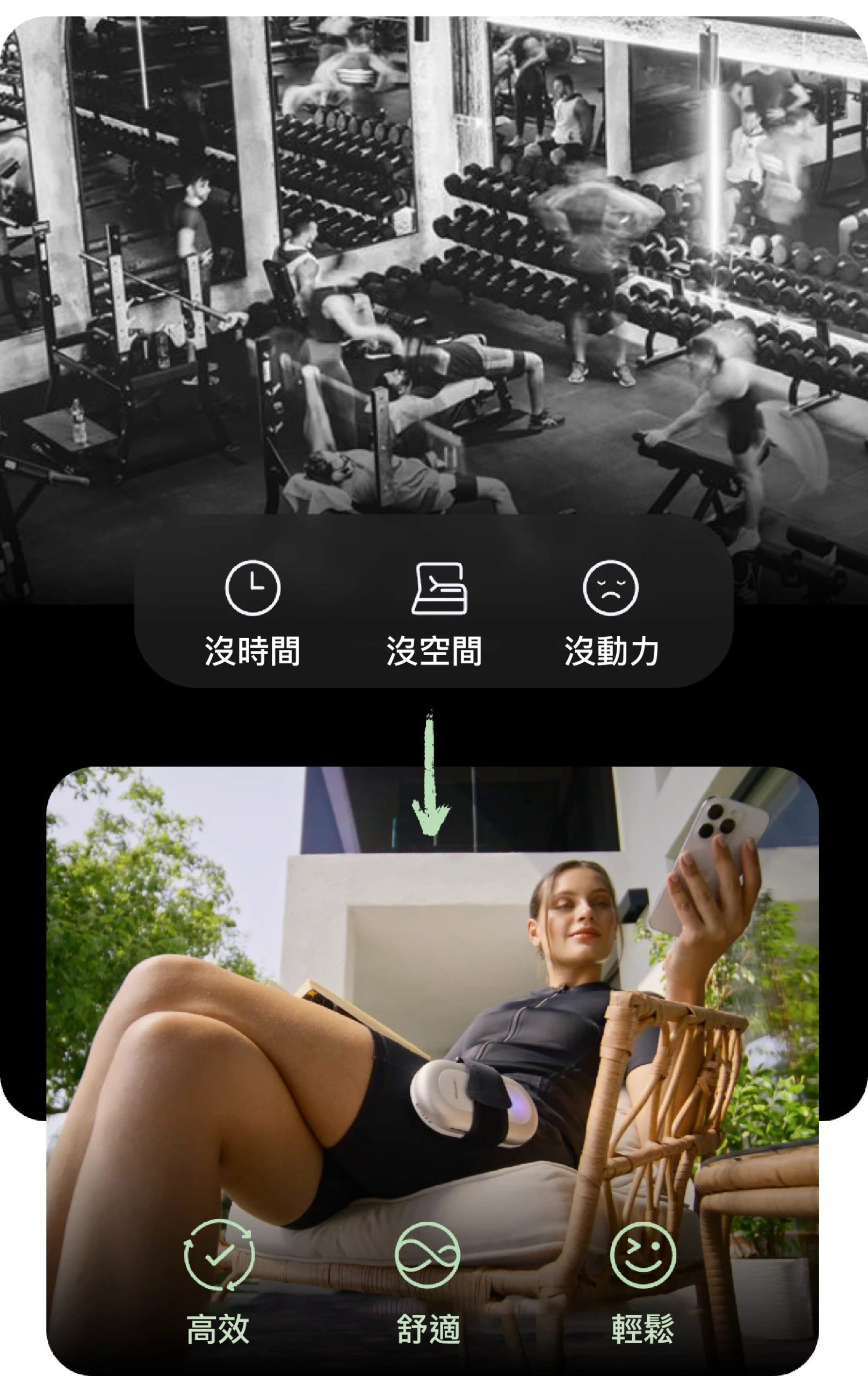 不同於可能造成拉傷或受傷的傳統力量訓練,EMS 無需負重即可激活深層肌肉纖維。經臨床證實可鍛鍊肌肉、燃燒卡路里並改善姿勢——同時溫和到足以用於醫療復健,包括骨盆底治療和產後復健。