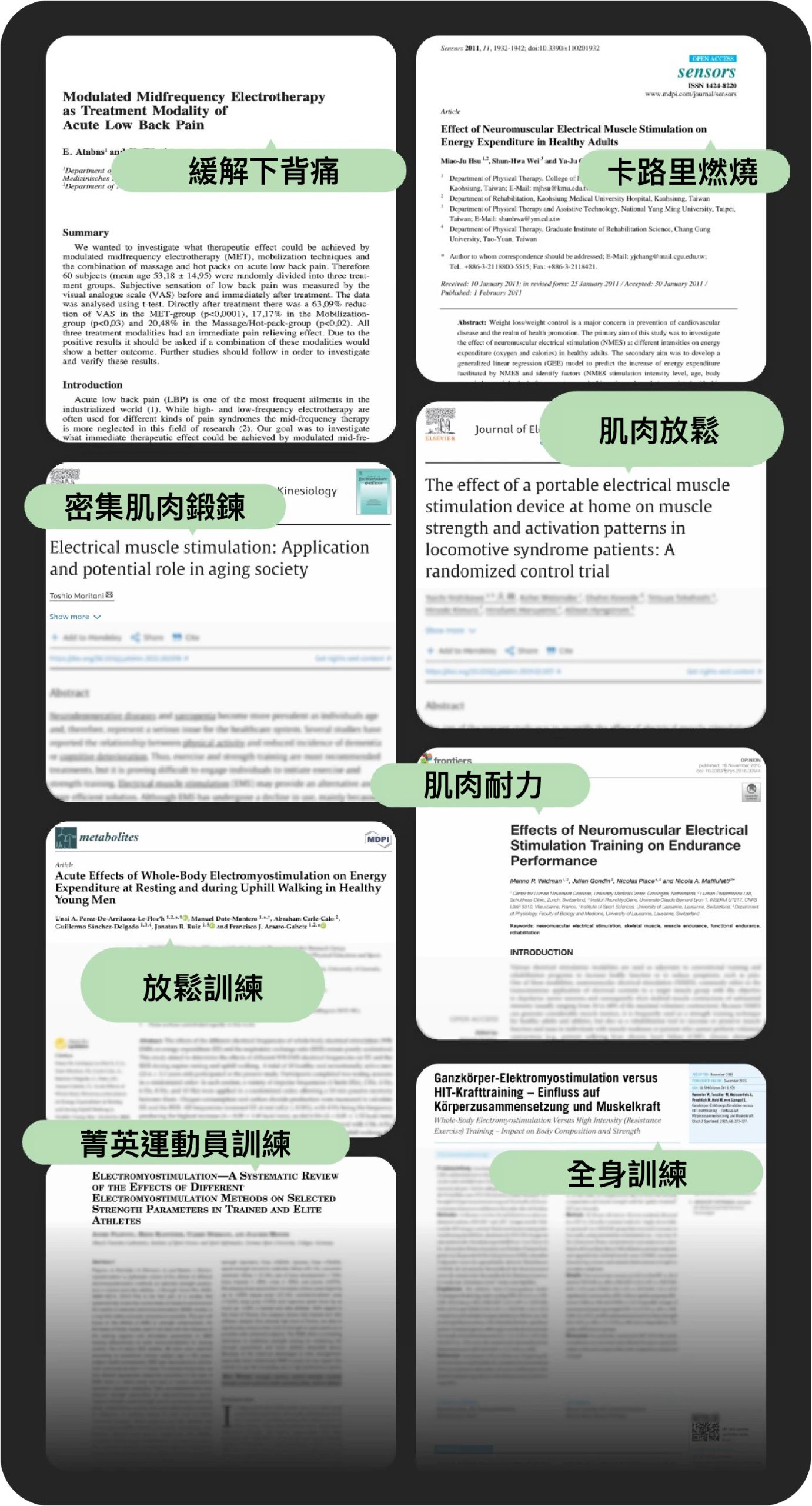 EMS 技術及其效果已獲得眾多研究機構、醫療組織和運動員的驗證。其應用範圍廣泛,我們致力於將這項專業技術帶入日常生活。