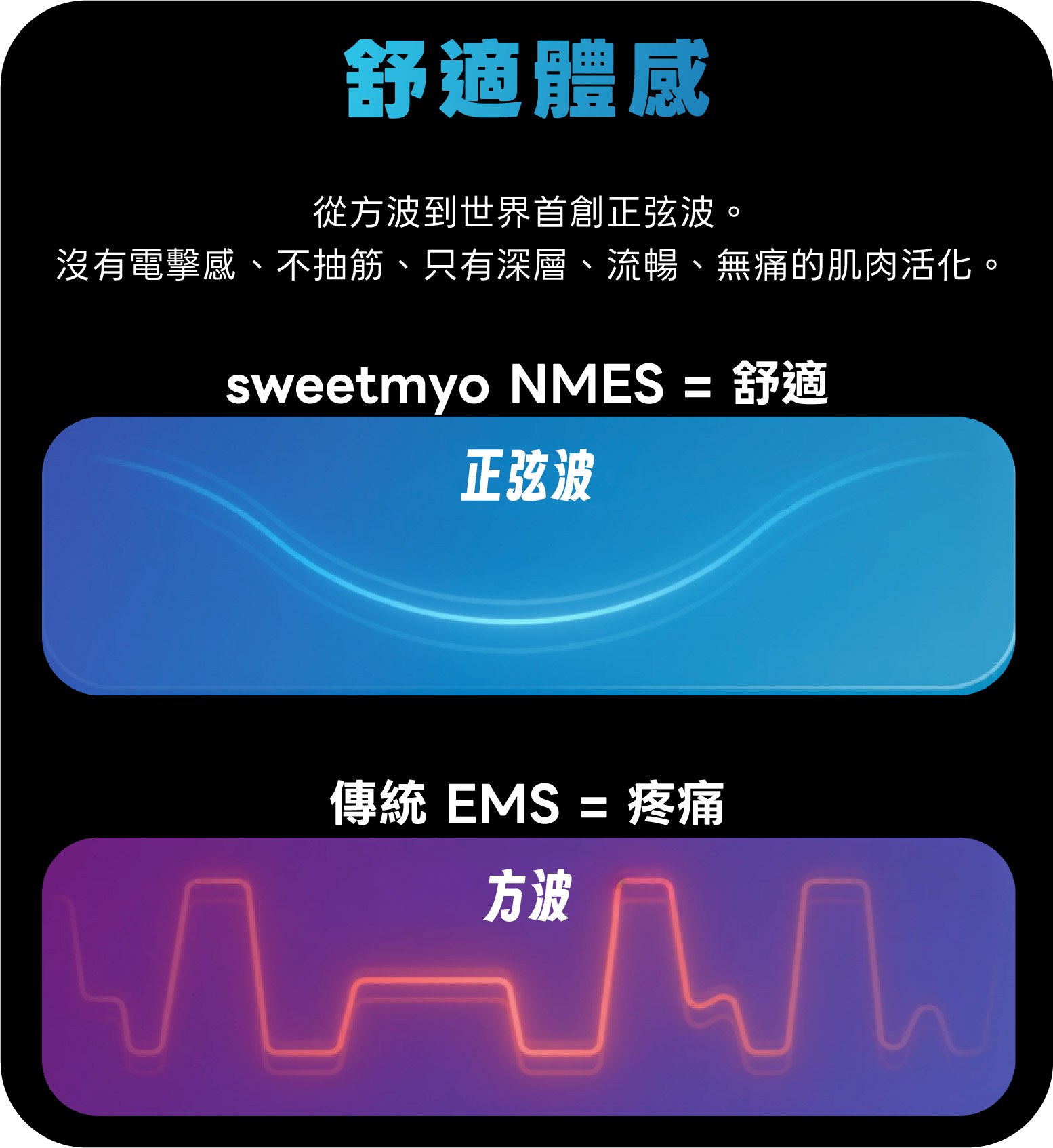 從方波升級為中頻正弦波。沒有突波、不會痙攣,只有深層、無痛的肌肉激活,是疼痛緩解和復健療程所需的精準技術!