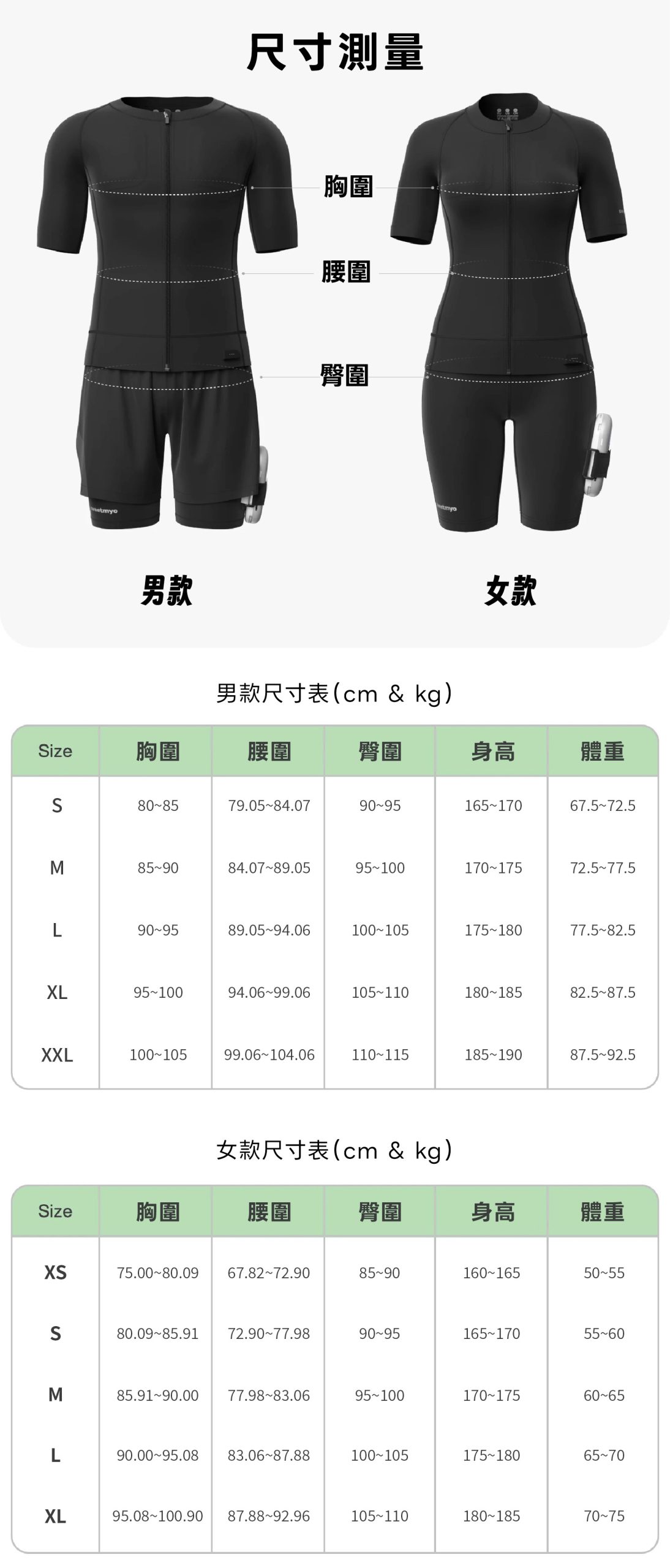 A:不是。我們提供多種尺寸以確保最佳貼合度、舒適性與效能。下單前請參考尺寸表。身高、體重與胸圍/胸圍是選擇正確尺寸的關鍵因素。Sweetmyo 設計為稍微貼身,讓內部貼片與您的皮膚保持緊密接觸,確保最佳 EMS 效能與明顯成效。