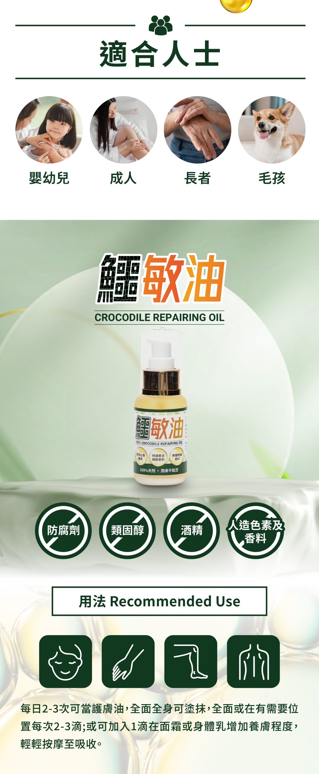 科學研究顯示,鱷魚油具有減輕關節與肌肉腫脹與炎症的作用,同時能改善多種皮膚狀況。