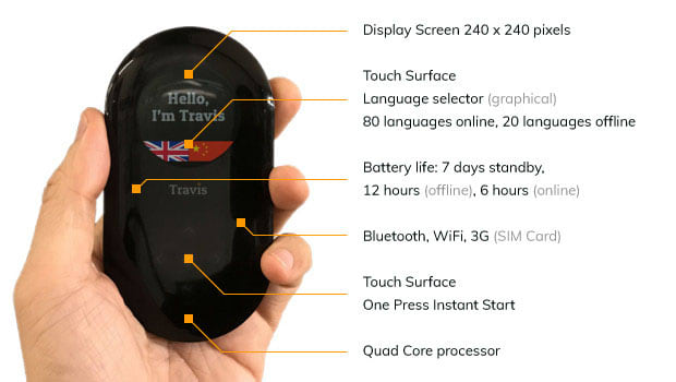 Travis is a portable device that uses artificial intelligence to translate speech to speech in 80 languages, all in less than two seconds. Travis has some unique features that include: