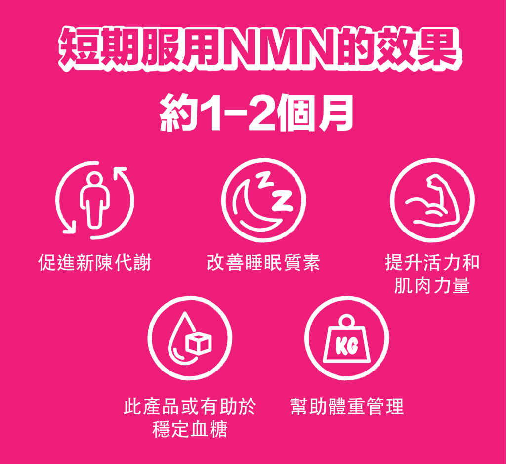 注意:停用產品不會倒退已逆轉的健康效果。NMN現只在臨床階段,剛已完成100人的1期臨床測試,正展開2期中。