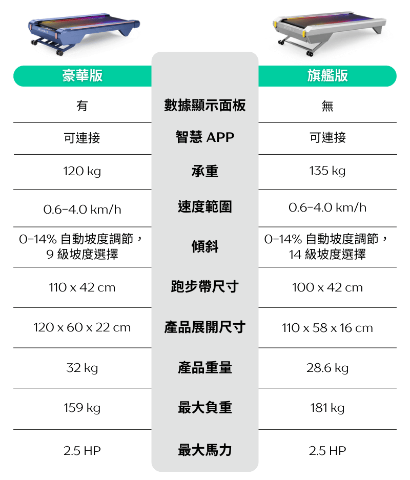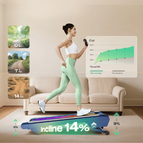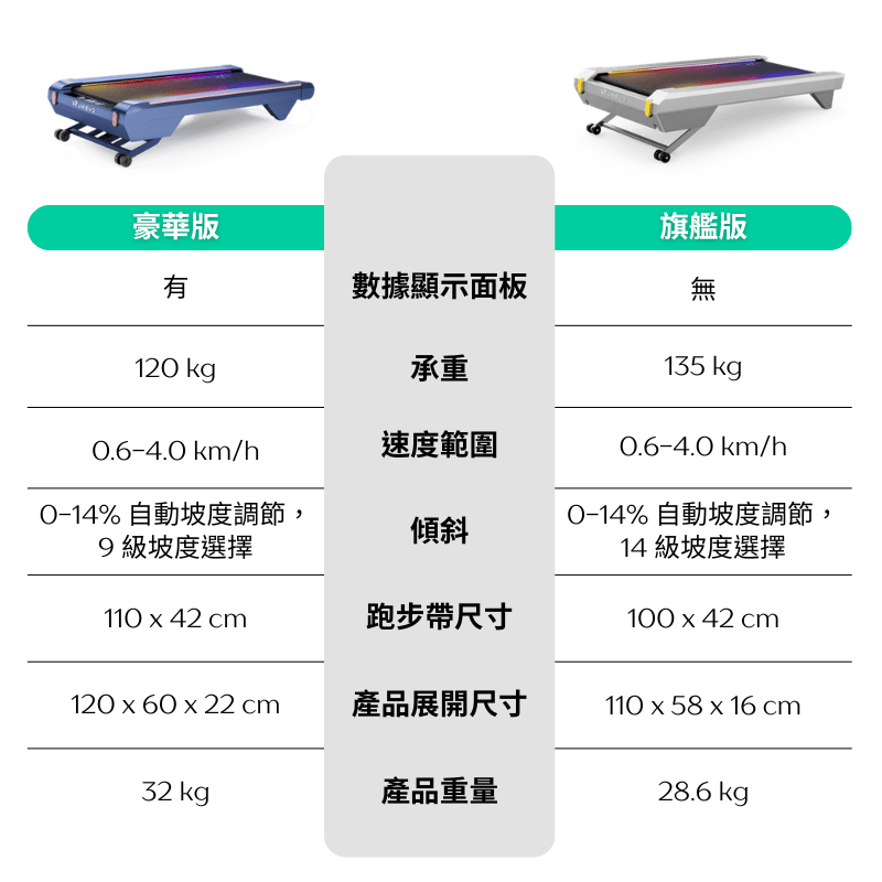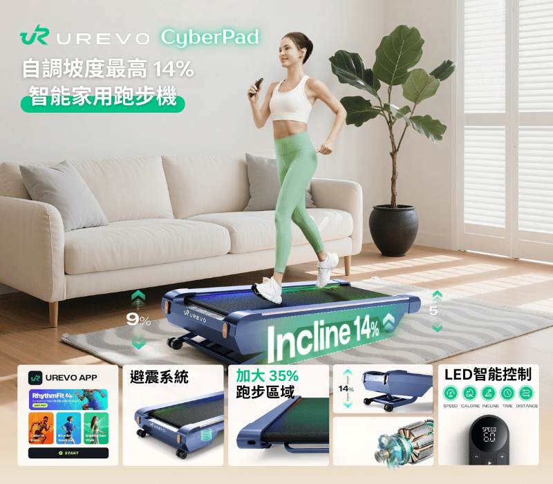 A: CyberPad 的最大特色是 可調整坡度設計(最高 14%),能模擬爬坡運動,提高運動強度與燃脂效率,比一般平面走步機更有訓練效果。