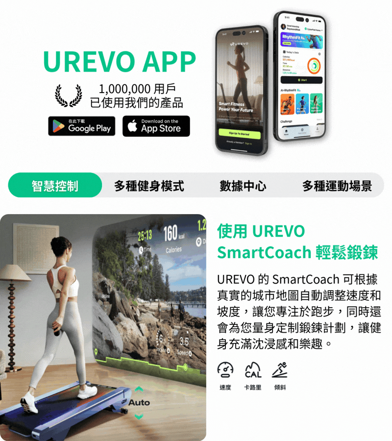 UREVO APP 擁有不斷更新的訓練庫,無論在設備上或設備外,都可以隨時隨地享受完整的 UREVO APP 體驗!