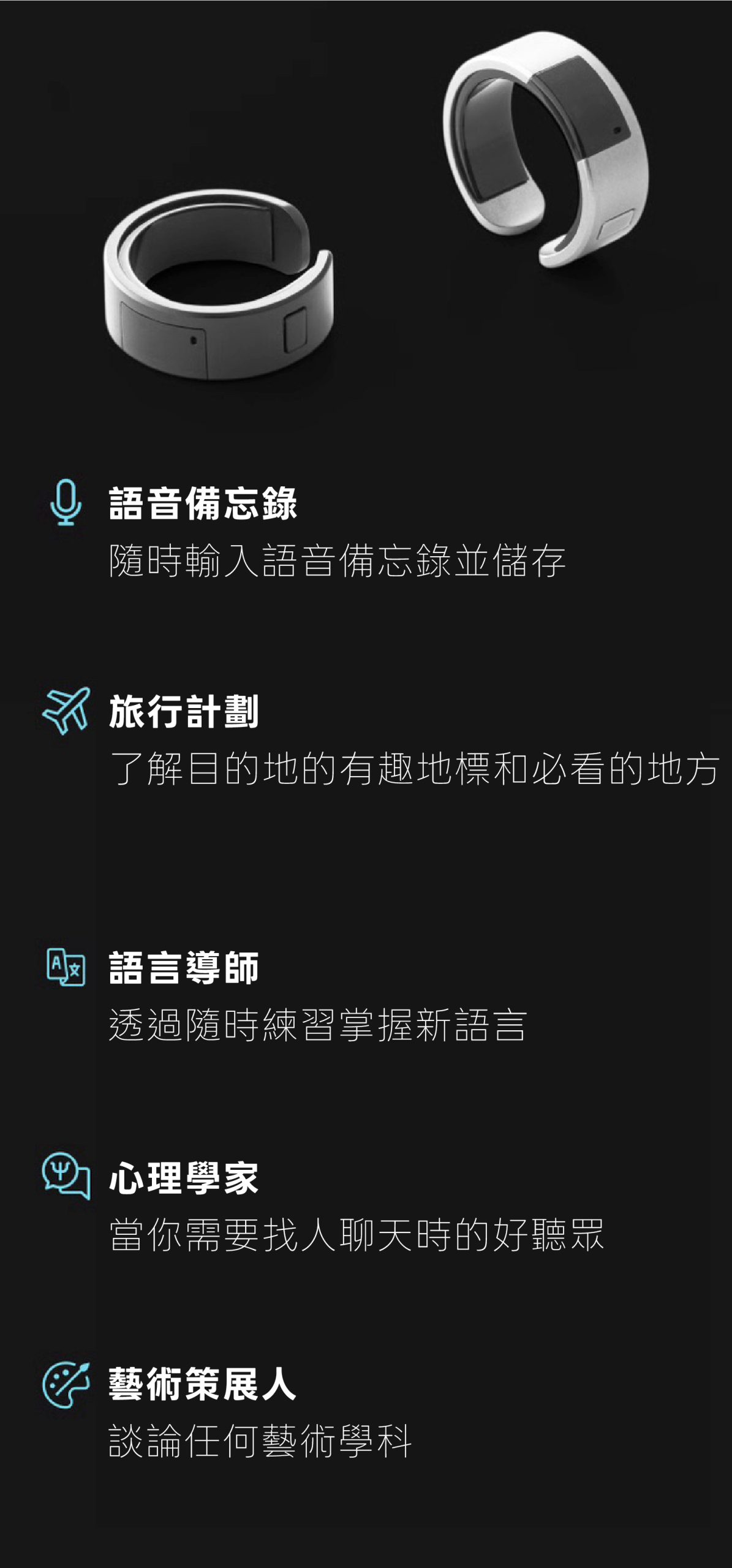 有了 WIZPR RING,你身邊永遠有個個人助理。WIZPR RING 是你的數位心理師、藝術策展人、旅行規劃師等等。不管你想聊天氣預報、聽個笑話,還是需要有人聽你說說煩惱。