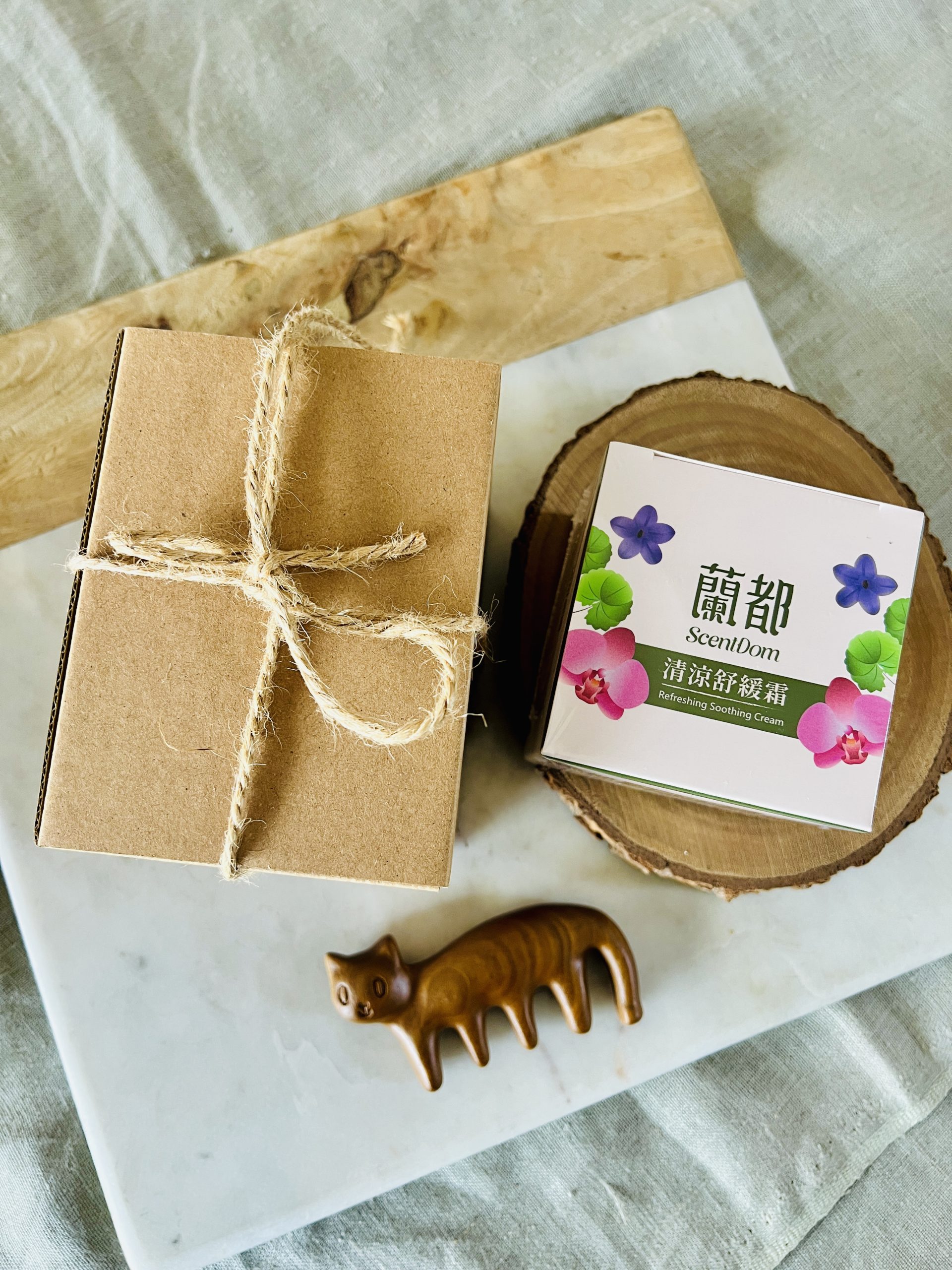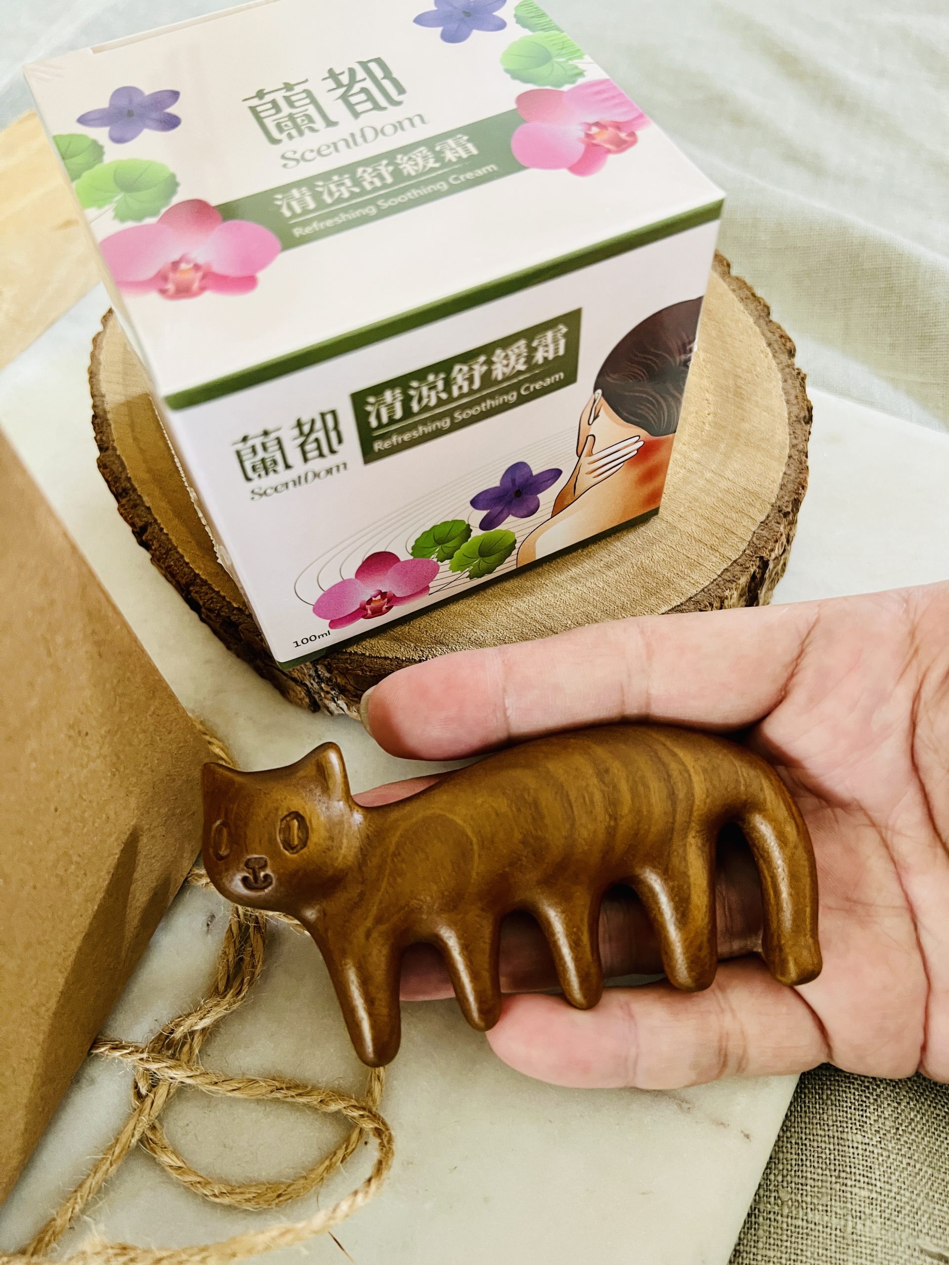小禮盒裝,包含檀木貓咪經絡梳一把,蘭都三條根 清涼舒緩霜一罐!