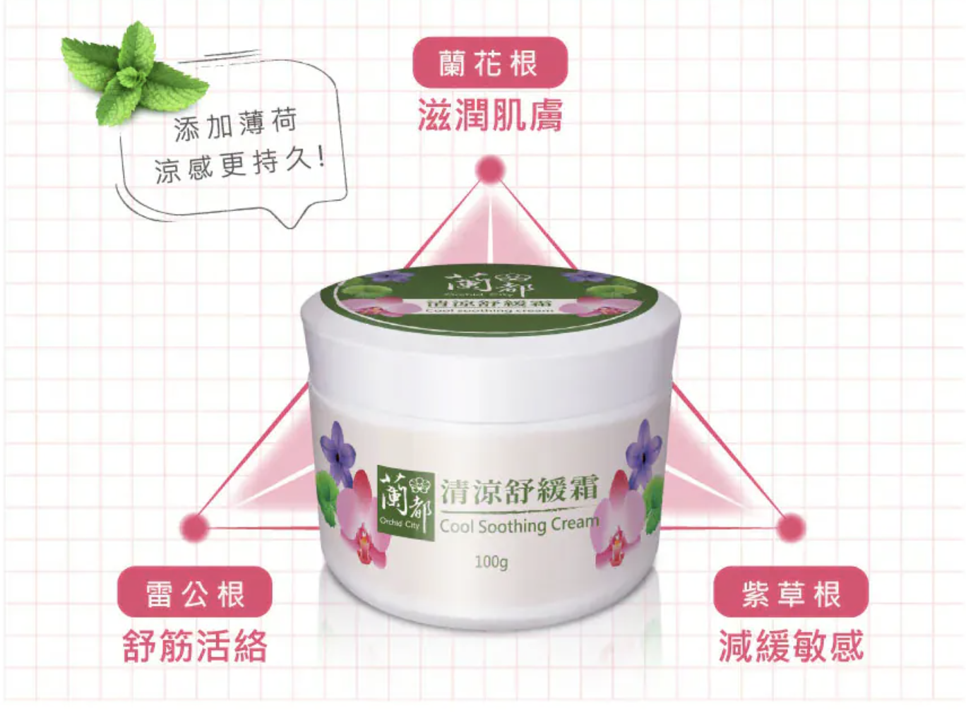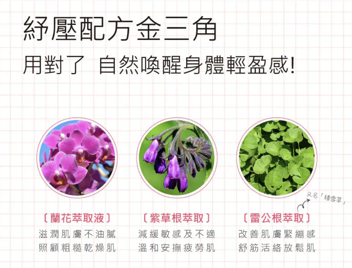 蘭花精萃、紫草根、雷公根三種草本能量,搭配薄荷清涼感,