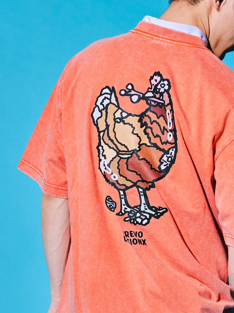 WooLeeX 櫻花動物珊瑚橘水洗T-Shirt(公雞)(品牌直送)