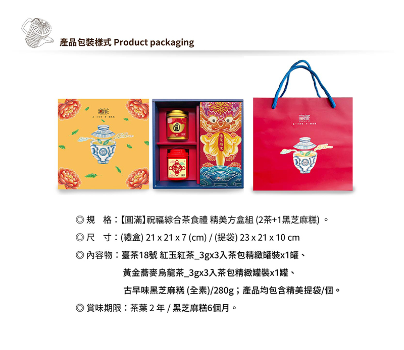 內容物:小茶罐3gx3入茶包x2罐(蕎麥烏龍茶、紅玉紅茶)、黑芝麻糕280g。附提袋。
